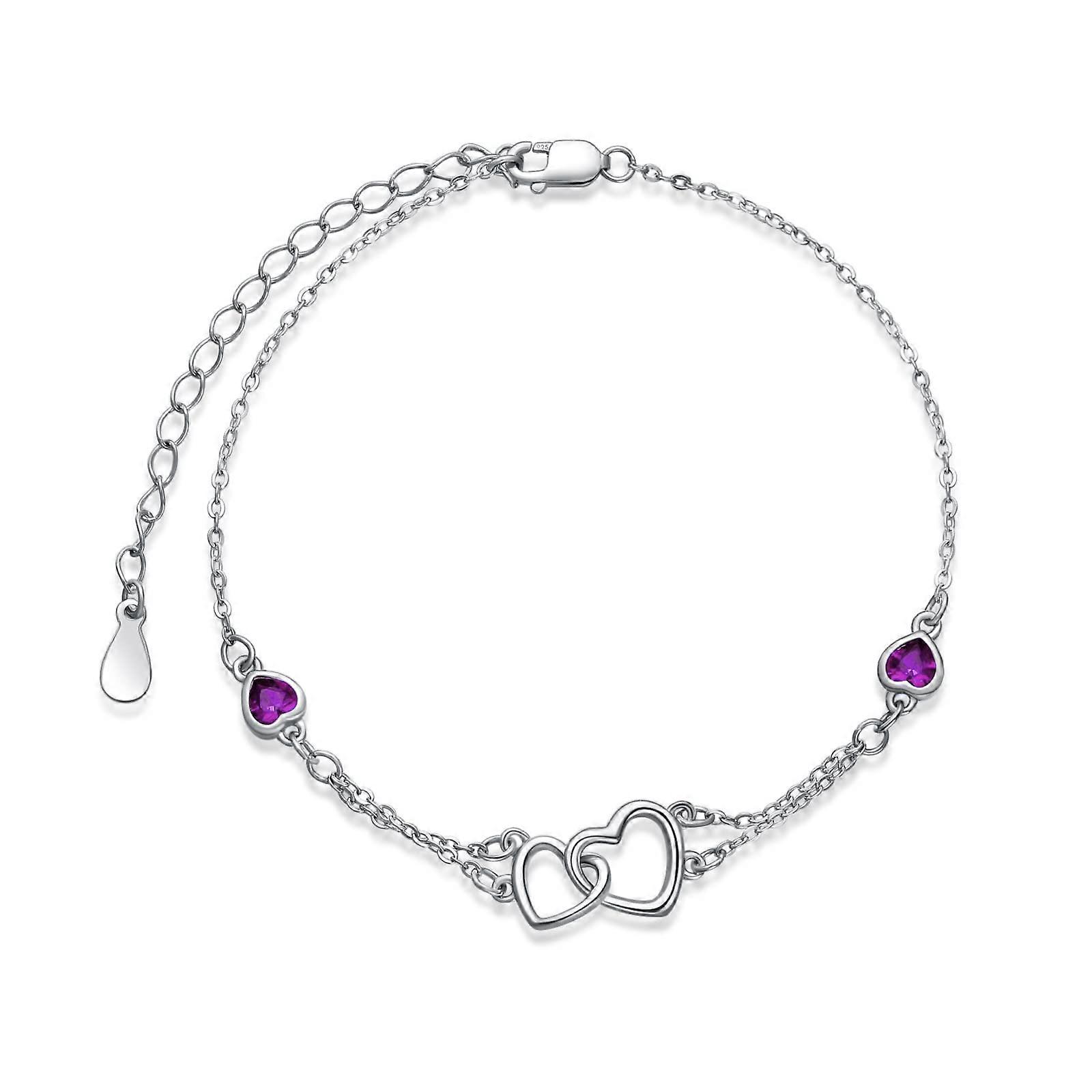 Anklet Bracelet for Women 925 Sterling Silver Amethyst Birthstone Jewelry Double Heart Chain 9''-11'' for Mom Wife Friend