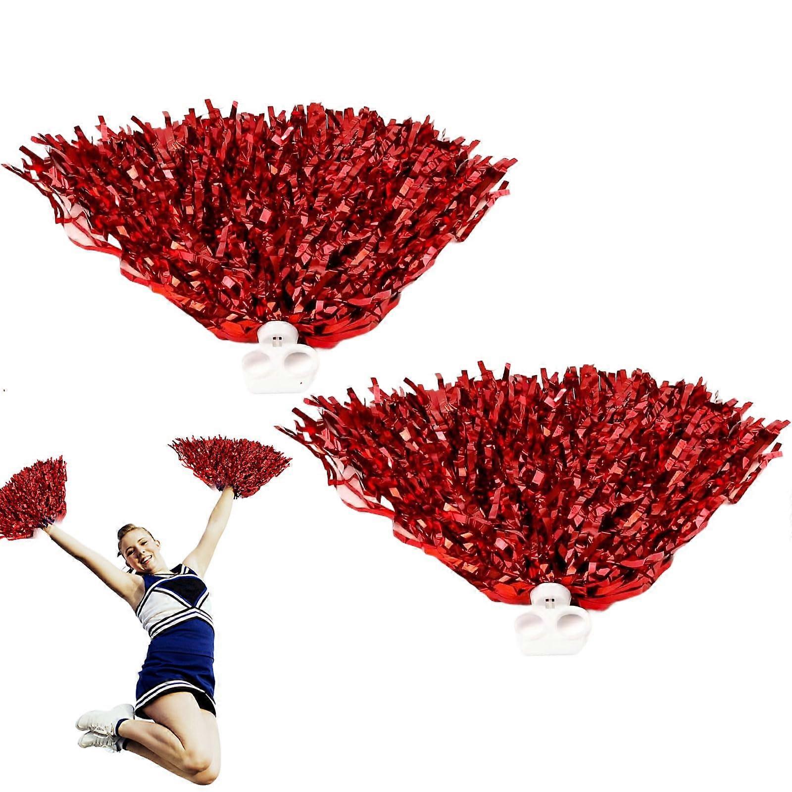Cheerleader Pompoms Pack Of 2, Metallic Foil Red Pom Poms For Sports Cheers