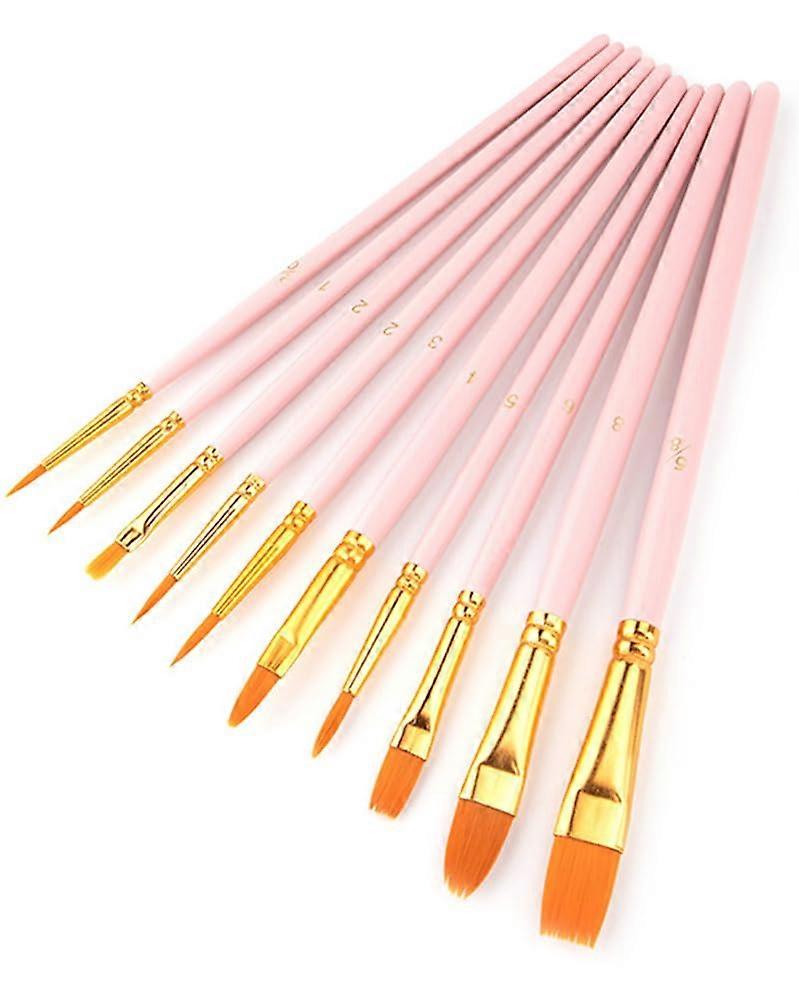 10 Piece Nylon Acrylic Paint Brush Set with Wooden Handles - Detail and Round Brushes for Acrylic, Watercolor, Oil, and Gouache (Pink)