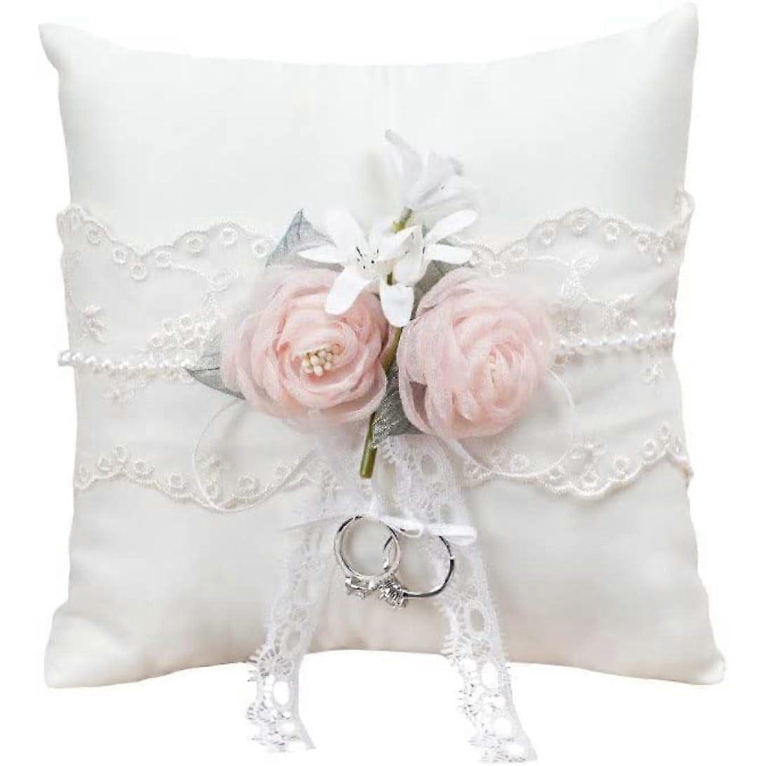 Ehering Ringkissen 20x20 cm Satin Weiß Dekoriert mit Spitzenblume für Hochzeitszeremonie und Ringträger
