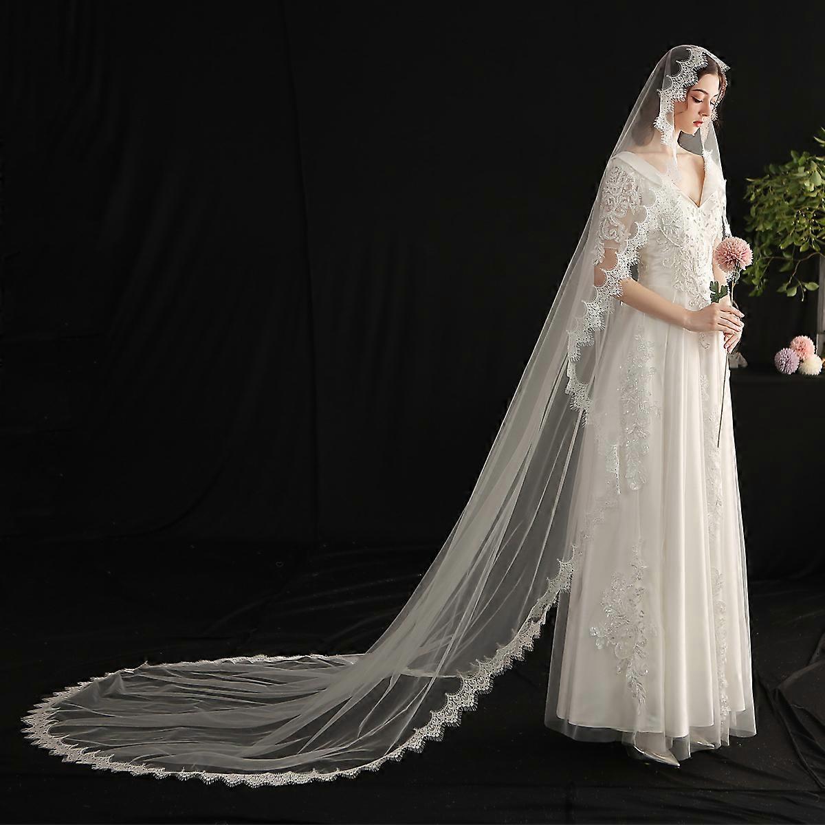 Vestuvinis nuotakos šydas, balti nėriniai, ilgas vestuvių galvos apdangalas