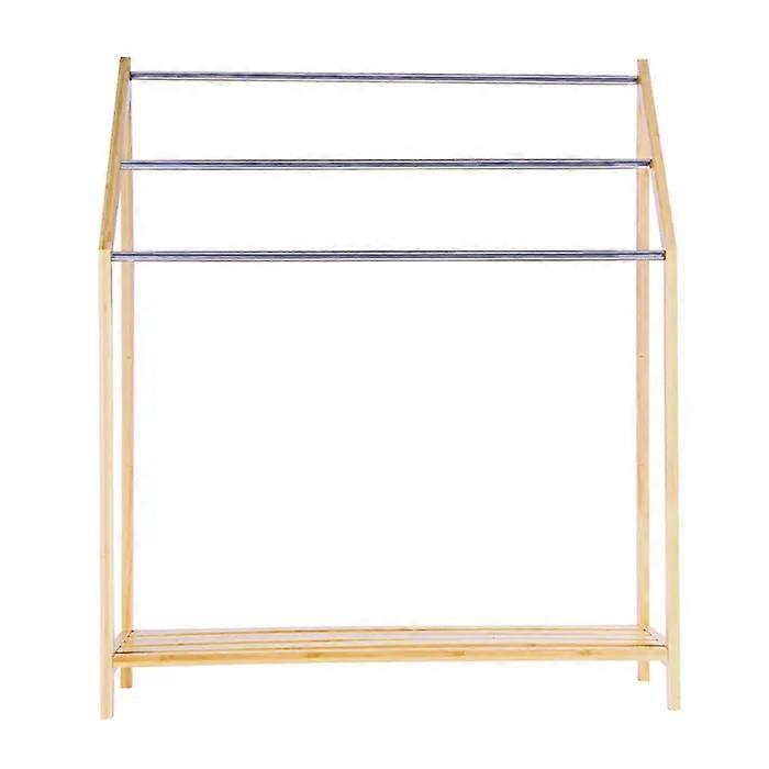 Material: Solid Bamboo With Matte Black Steel Frame Dimensions: 70 X 31 X 85 Cm (L X W X H) Colour: Natural Bamboo With Black Frame Type: Freestanding Towel Rack With 3 Rails And Bottom Shelf You Will Receive: