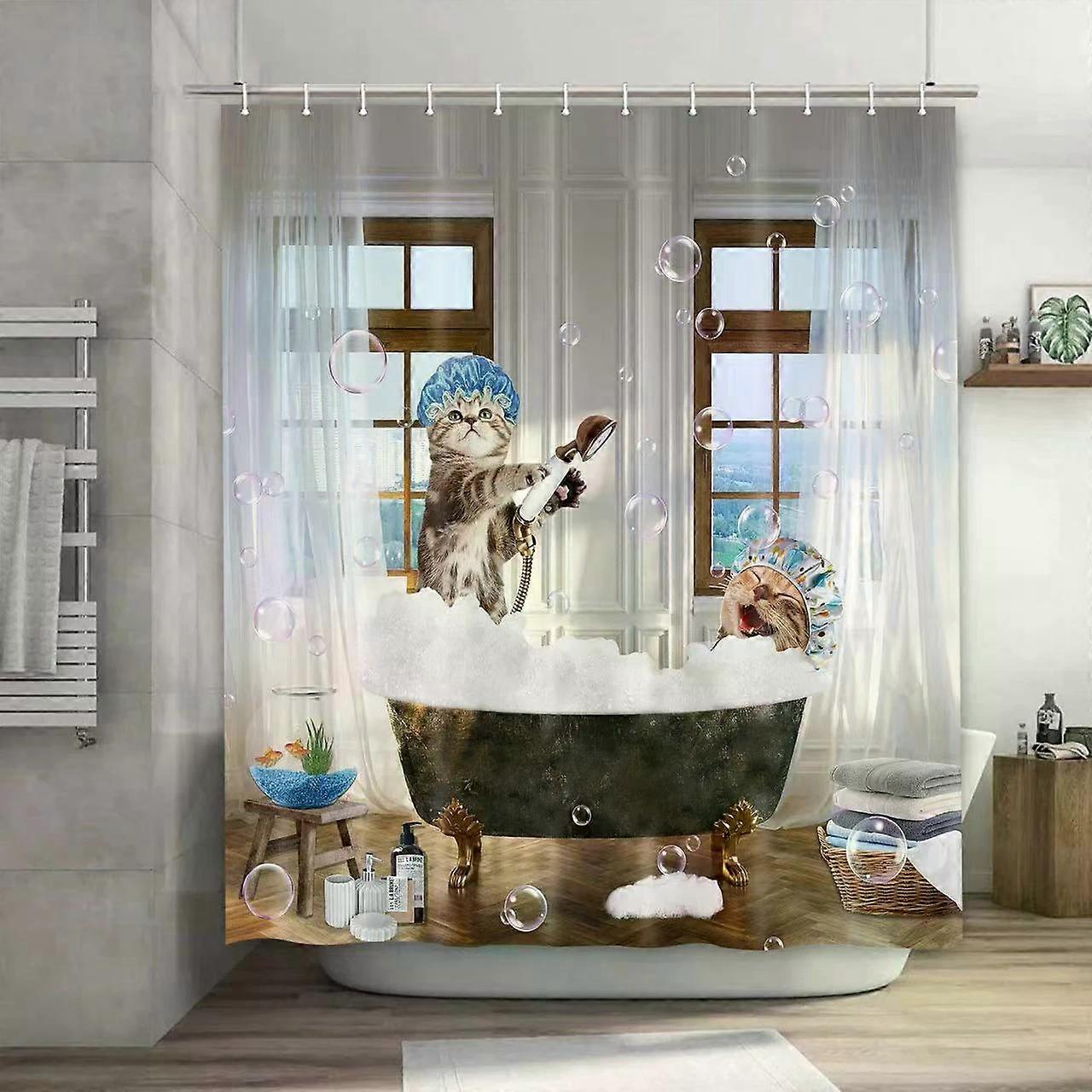 Funny Shower Curtains, Cat Riding Shark Ocean Birds Sea Waves Cool and Fun Polyester Fabric Bathroom Decor Sets for Kids, 240x180cm-94x70in~07723