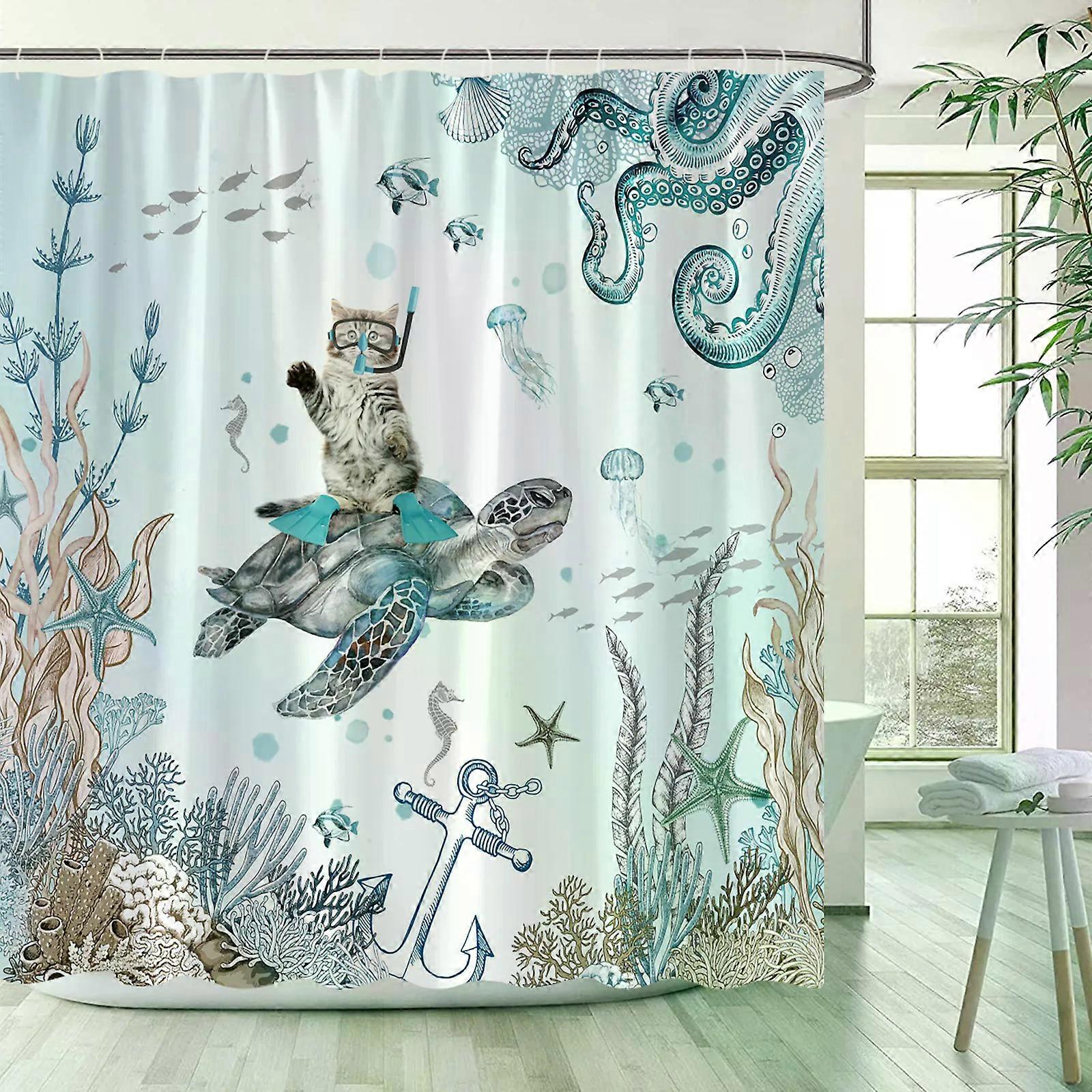 Funny Shower Curtains, Cat Riding Shark Ocean Birds Sea Waves Cool and Fun Polyester Fabric Bathroom Decor Sets for Kids, 220x180cm-86x70in~07644