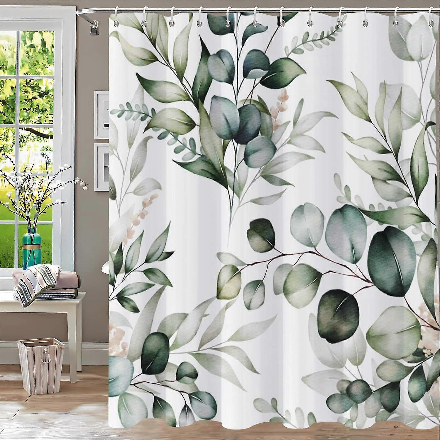 Odorless Shower Curtains, Tropical Green Leaf Plants on White Background, for Bathroom Showers and Bathtubs Decor with Hooks,180x210cm-70x83in~06759