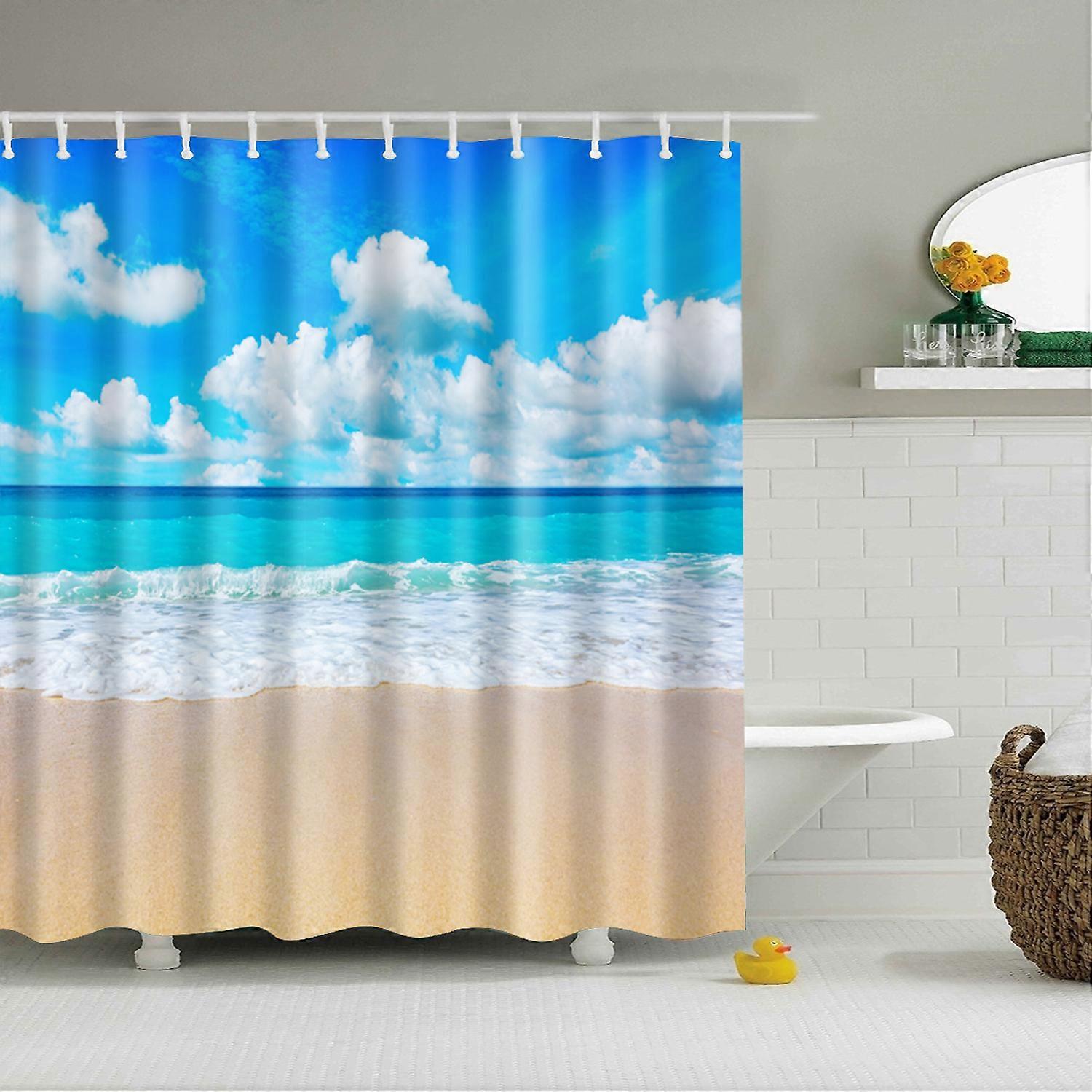 Blue Sky Beach Shower Curtain, Modern Landscape Print, 3D Blackout Curtain for Bathroom, W180xH240cm~05773