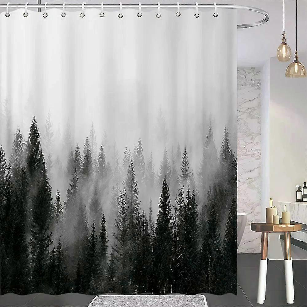 Washable Fabric Shower Curtain, Natural Bathroom Decor, Gray, White, Mountains, Birds, Pine Forest, Landscape, 180x230cm-70x90in~05543