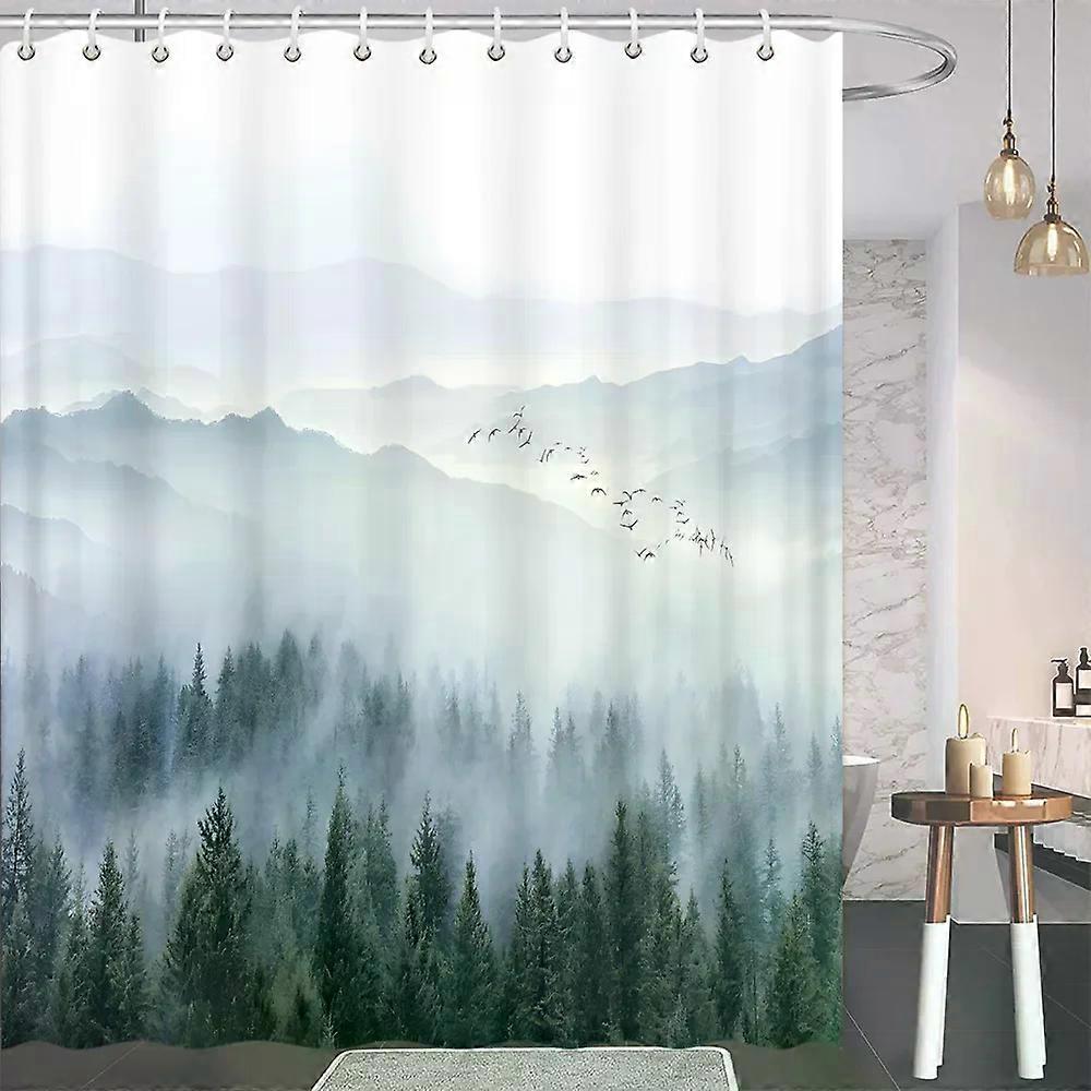 Washable Fabric Shower Curtain, Natural Bathroom Decor, Gray, White, Mountains, Birds, Pine Forest, Landscape, 90x180cm-35x70in~05588