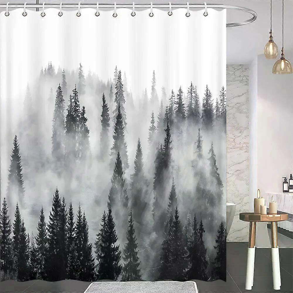 Washable Fabric Shower Curtain, Natural Bathroom Decor, Gray, White, Mountains, Birds, Pine Forest, Landscape, 240x180cm-94x70in~05474