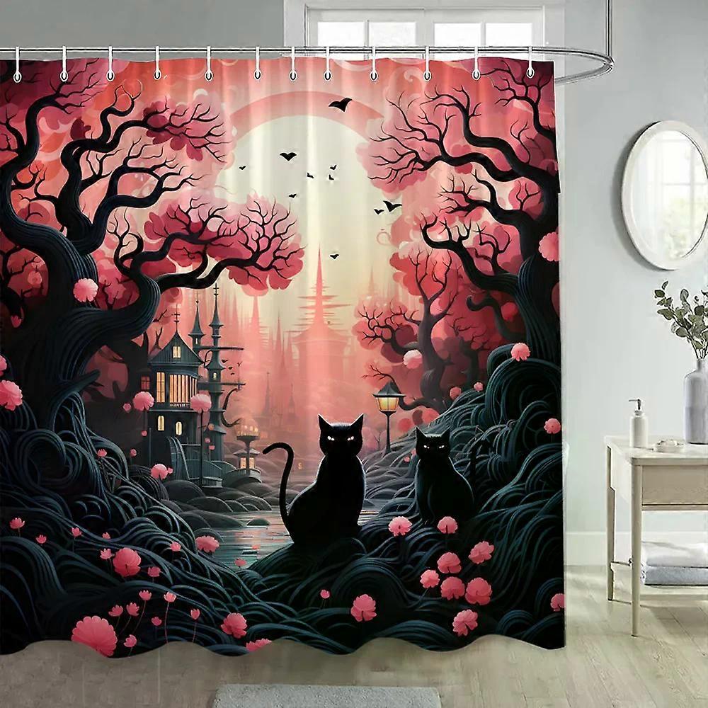Japanese Style Flower and Bird Shower Curtain Abstract Red Mountain Floral Plant Ink Art Landscape Fabric Decor Bathroom Curtains,180x180cm-70x70in