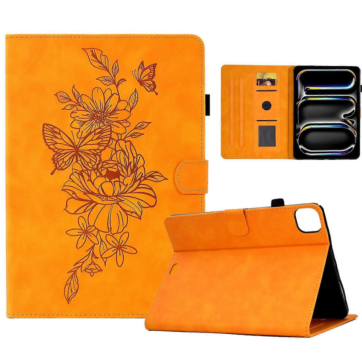 l5Z A4 For iPad Pro 11 (2024) Case Flower Butterfly Imprinted Card w8X Slots Leather Cover - Khaki