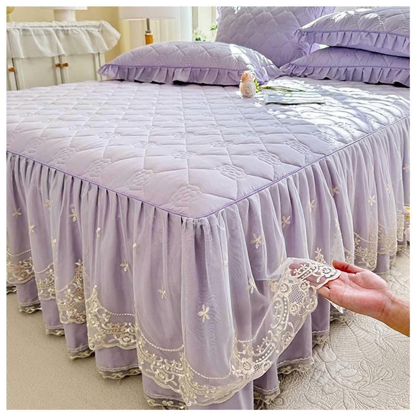 Soft Ruffled Bedspread Lace-Edge Fitted Sheet Wrap-Around Mattress Cover Purple 200x220 cm