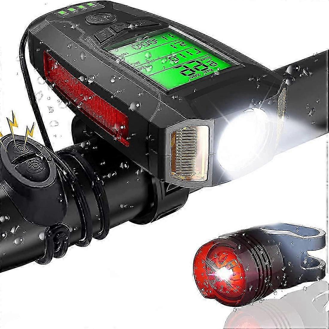 LED Bike Light Set with Bike Computer Rechargeable Bike Lights with Loud Bell Rear Light 5 Lighting Modes Cycling Light