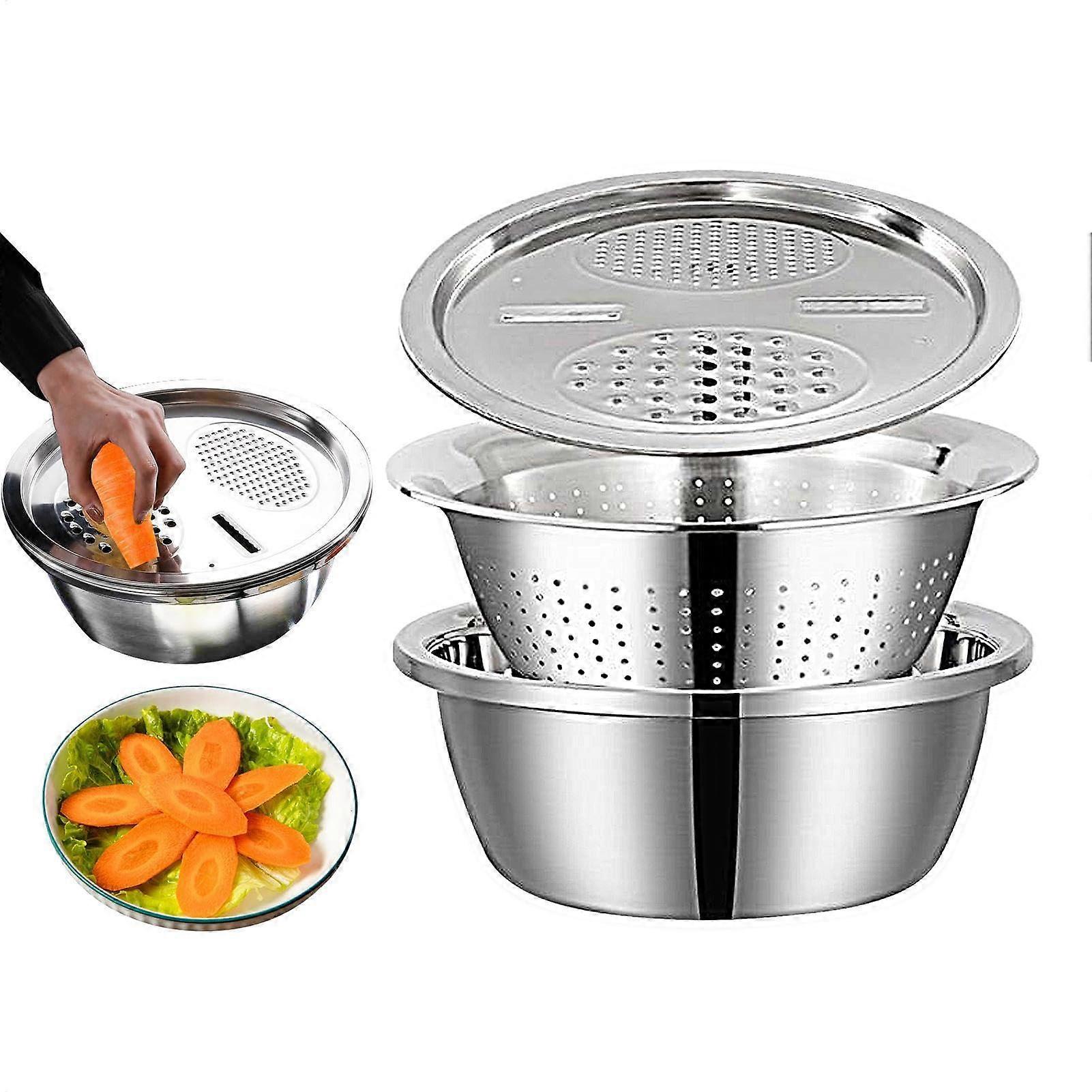 All-in-one kitchen set: fine strainer, spacious bowl, and multi-hole shredder with a built-in removable discharge basket — everything needed to wash, rinse, shred and drain without extra tools. Key benefits Save time: combine washing, draining and shredding in one compact set so you can prep ingredients faster and with fewer items to clean. Hygienic handling: the removable discharge basket separates washed produce from the main bowl for quick draining and easy drying. Consistent results: the shredder tray has multiple hole sizes to create uniform shreds for a range of ingredients, from fine to coarse. Stable and durable: the basin is built with a durable construction and robust handles for secure handling when filling, draining or moving the set. Less clutter: one multi-function set replaces separate strainers, bowls and graters so counter and storage space stay neater. Features Fine strainer: catches small particles and helps rinse rice, grains, berries, and leafy greens. Spacious bowl: room to wash and hold vegetables, fruit or pasta while you work. Multi-hole shredder tray: different hole sizes let you shred ingredients of varying thickness smoothly and efficiently. Built-in removable discharge basket: lift out the basket to drain pasta or fruits, then set it aside to air dry for better hygiene. Robust handles: provide a secure grip for lifting, pouring and transferring contents. Easy cleaning: the separate design simplifies washing and drying of each component. Practical applications Salad and produce prep: rinse and spin leafy greens or berries in the bowl, then drain using the removable basket for ready-to-serve salad ingredients. Shredding for recipes: grate carrots, cabbage, or cheese with the shredder tray’s different hole sizes to suit salads, slaws, soups and casseroles. Draining pasta or washing fruit: use the removable basket to strain cooked pasta or lift and drain washed fruit, then remove the basket for air drying. What you get Fine strainer, spacious basin, shredder tray with multiple hole sizes, and a removable discharge basket with sturdy handles — all designed to work together to simplify food prep. Care notes Separate components for easy washing and drying; designed for routine kitchen cleaning to maintain hygiene and performance.