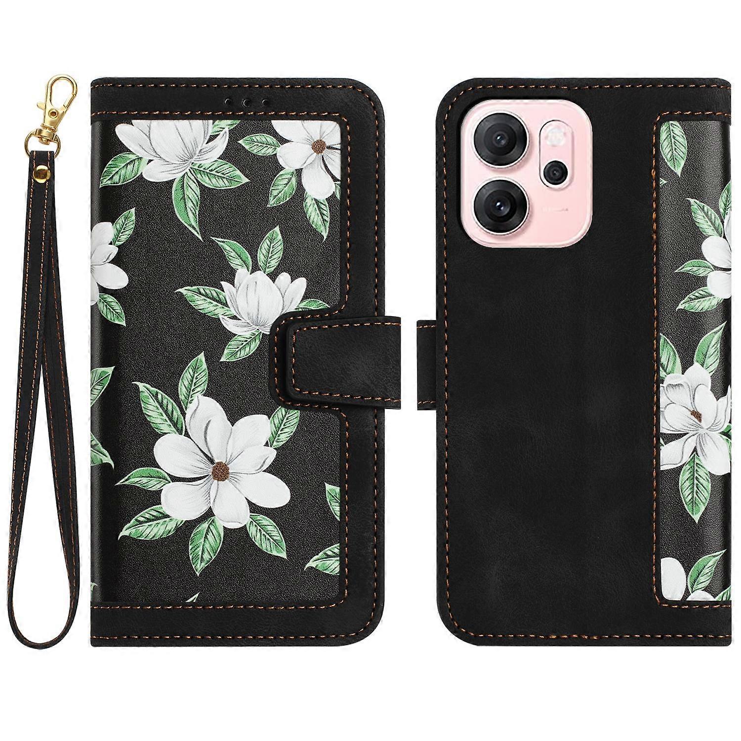 For Oppo Reno14 5G (Global) Case PU Leather Floral Phone Cover with Card Slots Wrist Strap - Black
