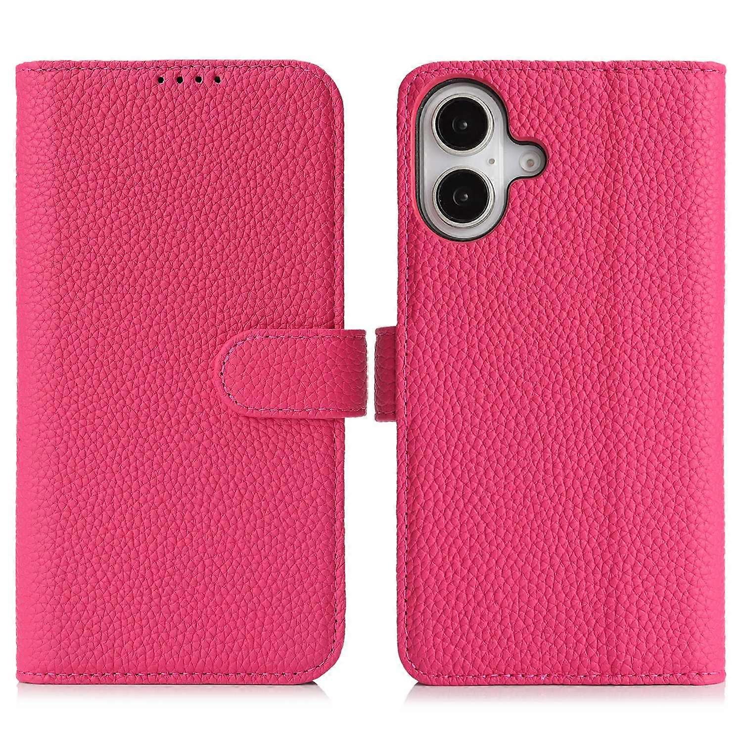 For iPhone 16 Stand Case Litchi Texture Genuine Cow Leather Wallet Phone Cover RFID Blocking - Rose