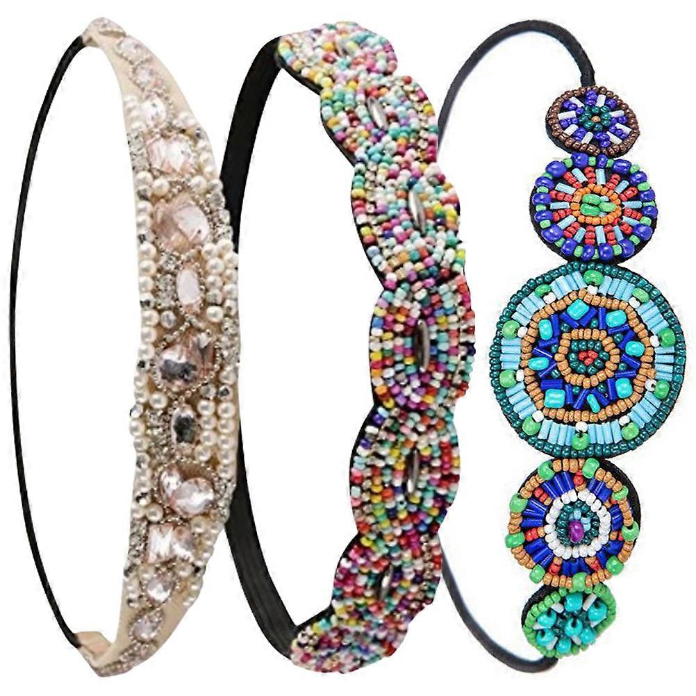 3pcs Elastic Rhinestone Headbands for Women Vintage Beaded Hair Jewelry Accessories, Comfortable Durable Stylish Design for All Day Wear