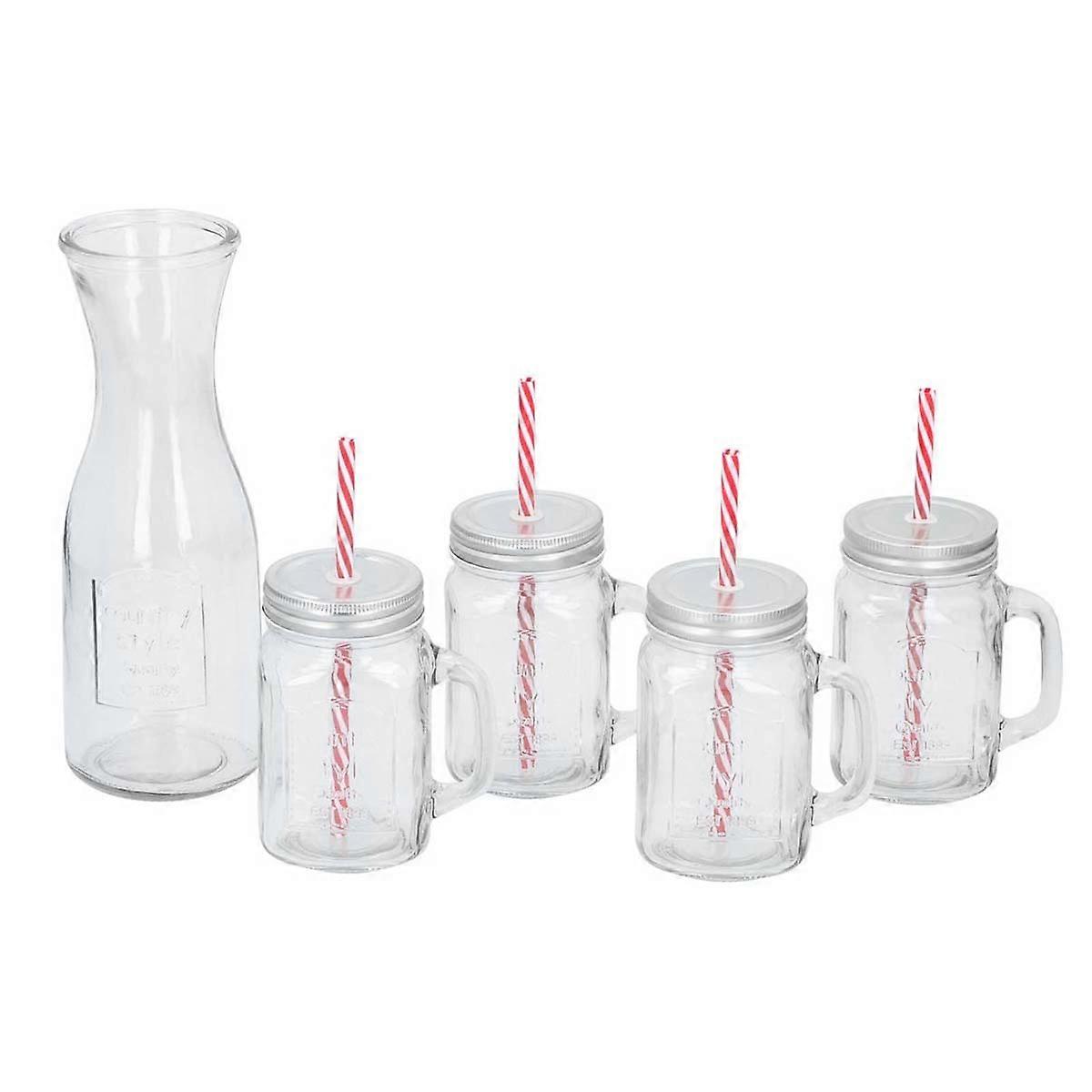 Set of Mugs with Straw 5 Pieces and 1 Carafe 1l in Glass, Transparent