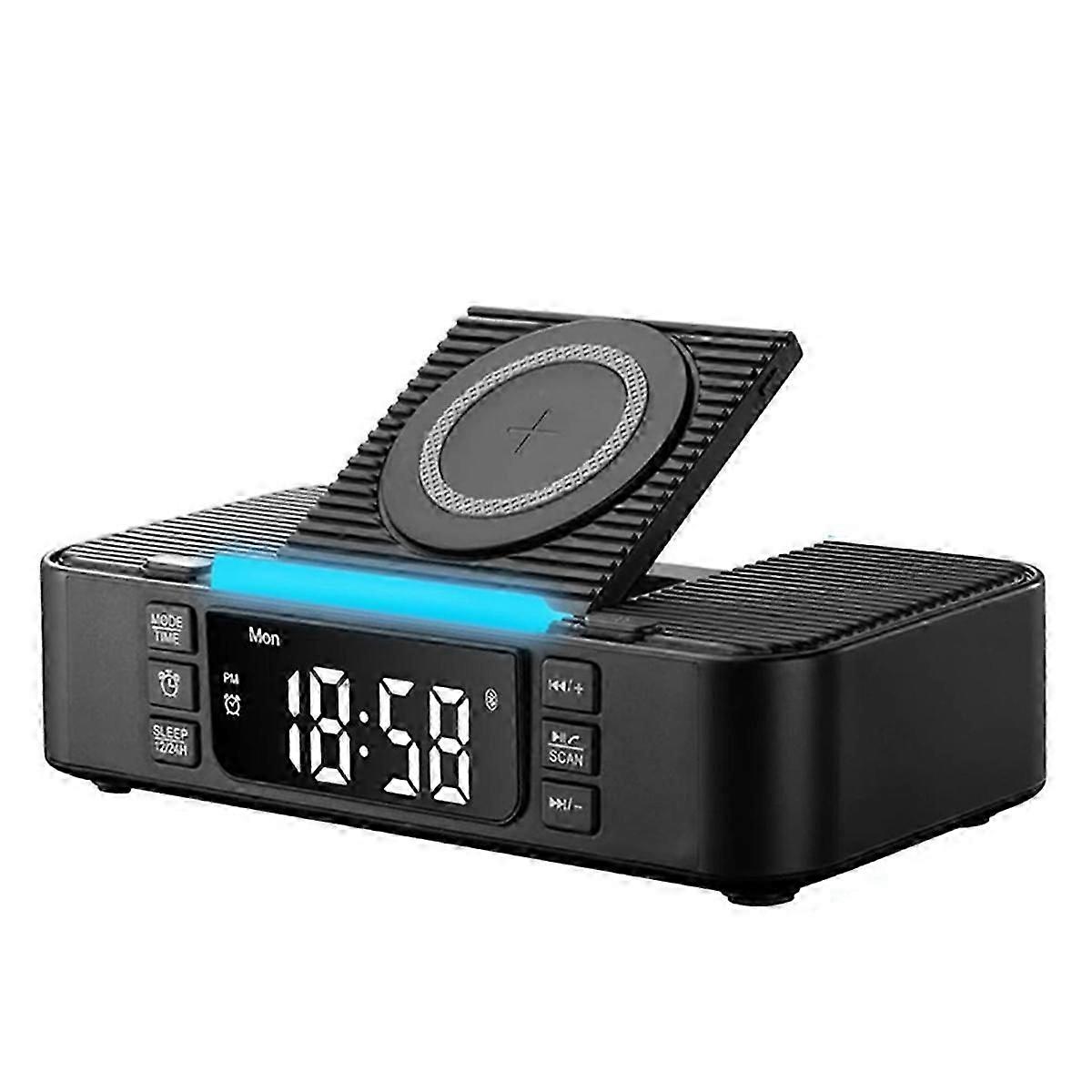 [Multifunctional bedside desktop companion]: 5.1 Bluetooth speaker, clear sound quality, built-in alarm clock, wireless charging, dual-line charging (USB-A+Type-C interface), adjustable mobile phone holder, hands-free viewing, FM radio and 3.5MM AUX audio playback, USB audio playback, 7-color adjustable night light, stylish and beautiful, perfect for your bedside and desk, making your messy desktop clean and tidy in an instant. [Safe and convenient charging station]: Wireless charging with built-in overheating/overcurrent/short circuit protection. The non-slip base can keep the phone aligned during charging. The charging stand can be adjusted freely, which is convenient for watching videos while charging. Just put your smartphone on it and charge it easily without wires! (Supports all and Android phones that support wireless charging, compatible with mobile phone cases with a thickness of 5mm). It is also equipped with 5V/2A USB and Type-C interfaces (data cable not included) to charge other electronic devices. [Bluetooth 5.1 Speaker and Digital Alarm Clock]: through 5W high-definition Bluetooth speakers, stable pairing over long distances, and clear sound quality. Equipped with an extra-large LED display with 5 levels of brightness, the display brightness can be adjusted as needed, 12/24 hours adjustable time and alarm, and equipped with a soft buzzer alarm + snooze function. The 7-color adjustable night light creates a and comfortable atmosphere at the bedside, allowing you to immerse yourself in a dream. [Space-saving, stylish and beautiful]: The compact design of 4.9x1.6x3.1 inches is stylish and beautiful. Suitable for bedside tables, offices or kitchens. Color: Black Material: plastic Package Contents: 1 x Wireless Charging Station 1 x USB Cable Only the above package content, other products are not included. Note: Light reflection and different disp