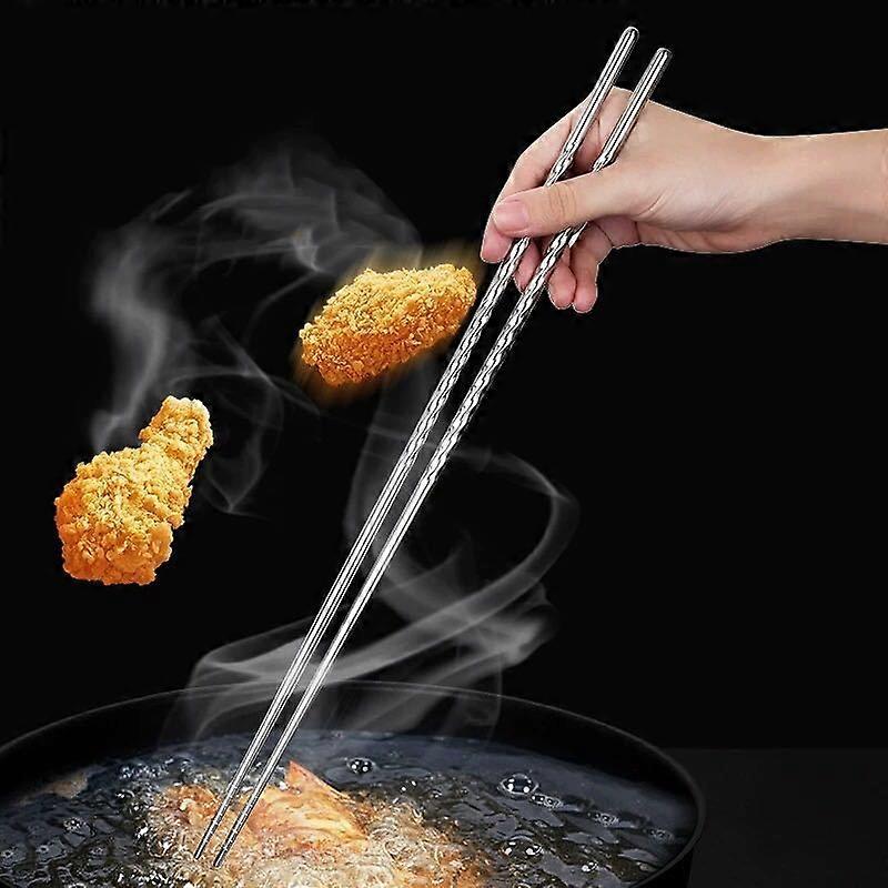 Description Crafted from durable stainless steel, these long reusable chopsticks are designed for cooking and frying tasks. Their heat-resistant and non-slip threaded design ensures a secure grip, making them ideal for handling hot foods in kitchens. The sleek round shape adds a modern touch to your cooking utensils collection. Features -Color:Silver -Material:Stainless steel -Size:38.50X0.65X0.65cm/15.13X0.26X0.26in -Longer design for safety: the 38.8 cm extended length keeps your hands safely away from hot surfaces, making it ideal for hightemperature cooking like frying and boiling -Durable stainless steel material: made from sturdy stainless steel, these chopsticks are built to last, resist debris, and are easy to clean, perfect for daily use -Nonslip threaded grip: the antislip threaded design ensures a secure hold, even when handling slippery or oily foods, improving your cooking precision -Versatile for various cooking needs: perfect for tasks like retrieving noodles from soup pots, frying food in oil, or handling hot pot ingredients with ease -Essential for asian cuisine: a musthave tool for preparing asian dishes, these chopsticks are suitable for home kitchens, restaurants, and culinary enthusiastsPackage list: 6 x pairs of stainless steel chopsticks