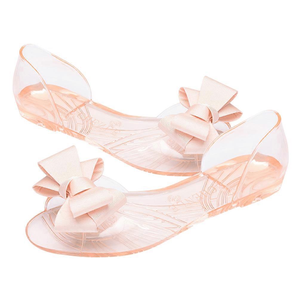 Here's a refined and engaging product description based on the details you've provided: **Flat Jelly Shoes for Women – Beige Bowknot Sandals |