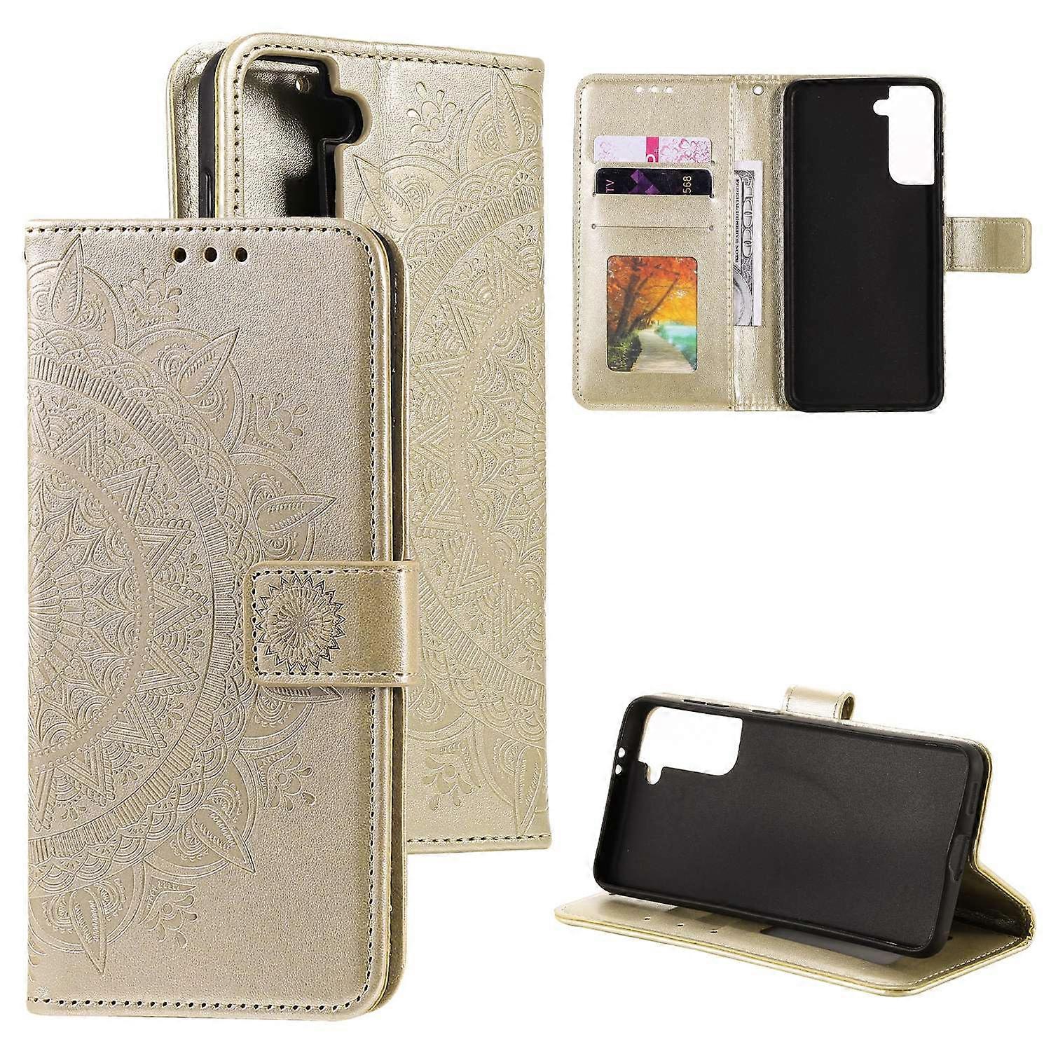 Imprinted Mandala Flower Wallet Leather Case for Samsung Galaxy S21 4G 5G Stand Flip Cover - Gold