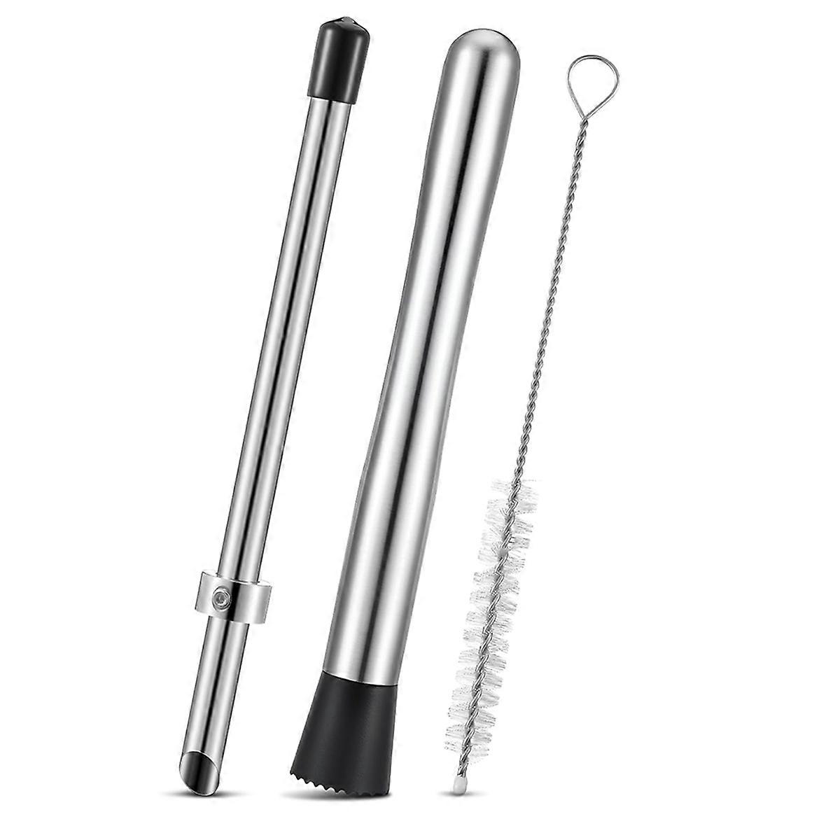 Lemonade Stand Tool Set: package includes 1 straw puncher and 1 stainless steel muddler, ideal for setting up your very own refreshing lemonade stand Food Grade Materials: crafted from 304 stainless steel, both muddler and puncher durability, rust-resistance, and safe, delicious drinks; The puncher's 12.7 mm hole and 22 cm length effortlessly pierce cups and lids for a nice straw fit Sturdy Muddler: the 25 cm muddler features a 3.3 cm diameter base, ideal for crushing fruits, ice, and more without leaving behind any unwanted residue or rust; Its nylon-protected head adds crushing strength while preventing scratches on your cups Comfort and Safe Use: the muddler's handle is designed with human ergonomics in mind, providing a comfortable grip during extended use; The puncher includes a silicone cap to protect your hands from edges Lemonade Stand Essential: made for a lemonade stand, this tool set ensures drinks are prepared quickly and efficiently; With the masher and punch, you can fresh, delicious lemonade to eager customers in no time, keeping lines flowing and smiles on their Color: Silver + Black Material: Stainless Steel Package Contents: 1 x straw puncher 1 x Cleaning brush 1 x stainless steel muddler Only the above package content, other products are not included. Note: Light reflection and different displays may cause the color of the item in the picture a little different from the real thing. The measurement allowed error is +/- 1-3cm.