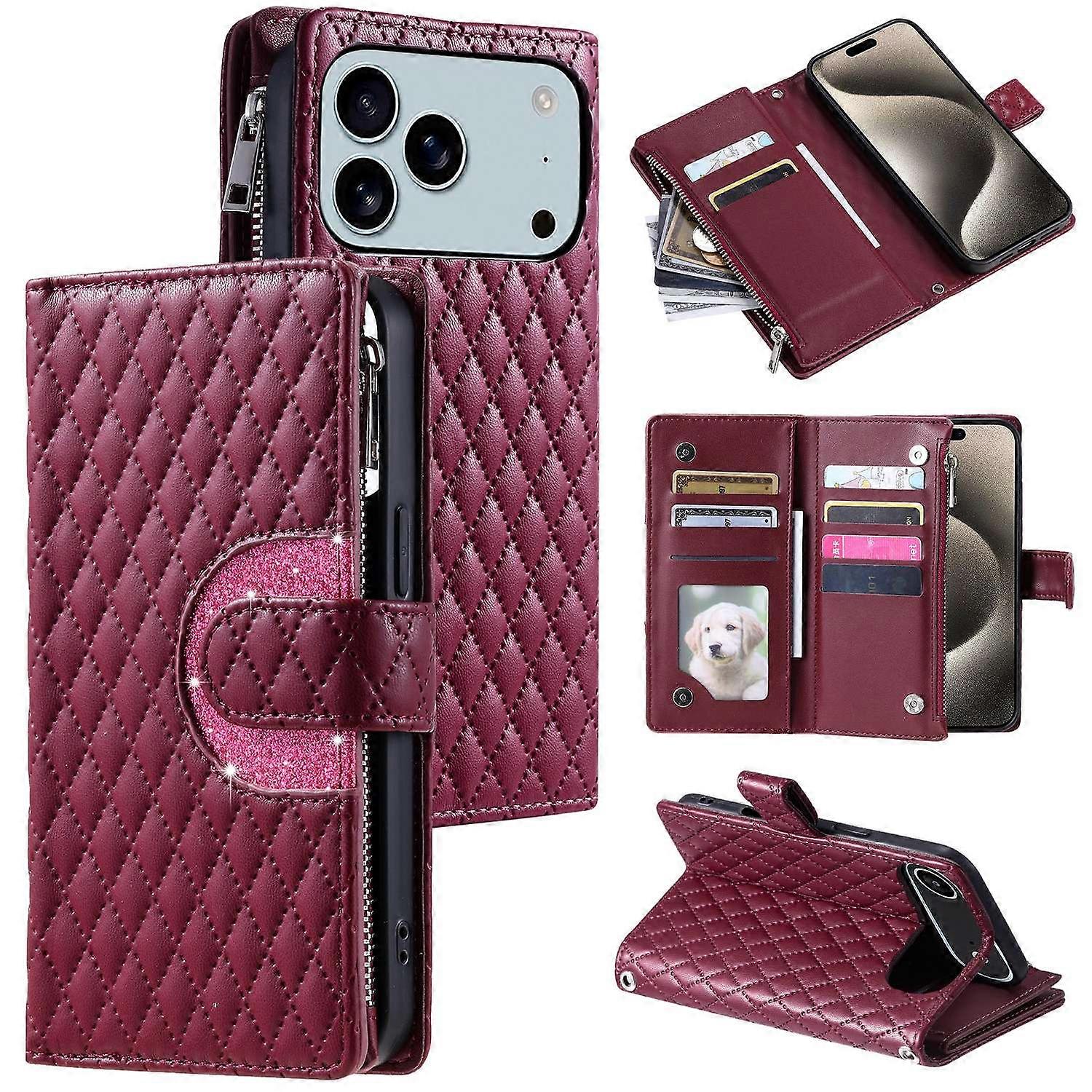For iPhone 17 Pro Max Case Zipper Pocket Glitter Leather Phone Cover with Wrist Strap