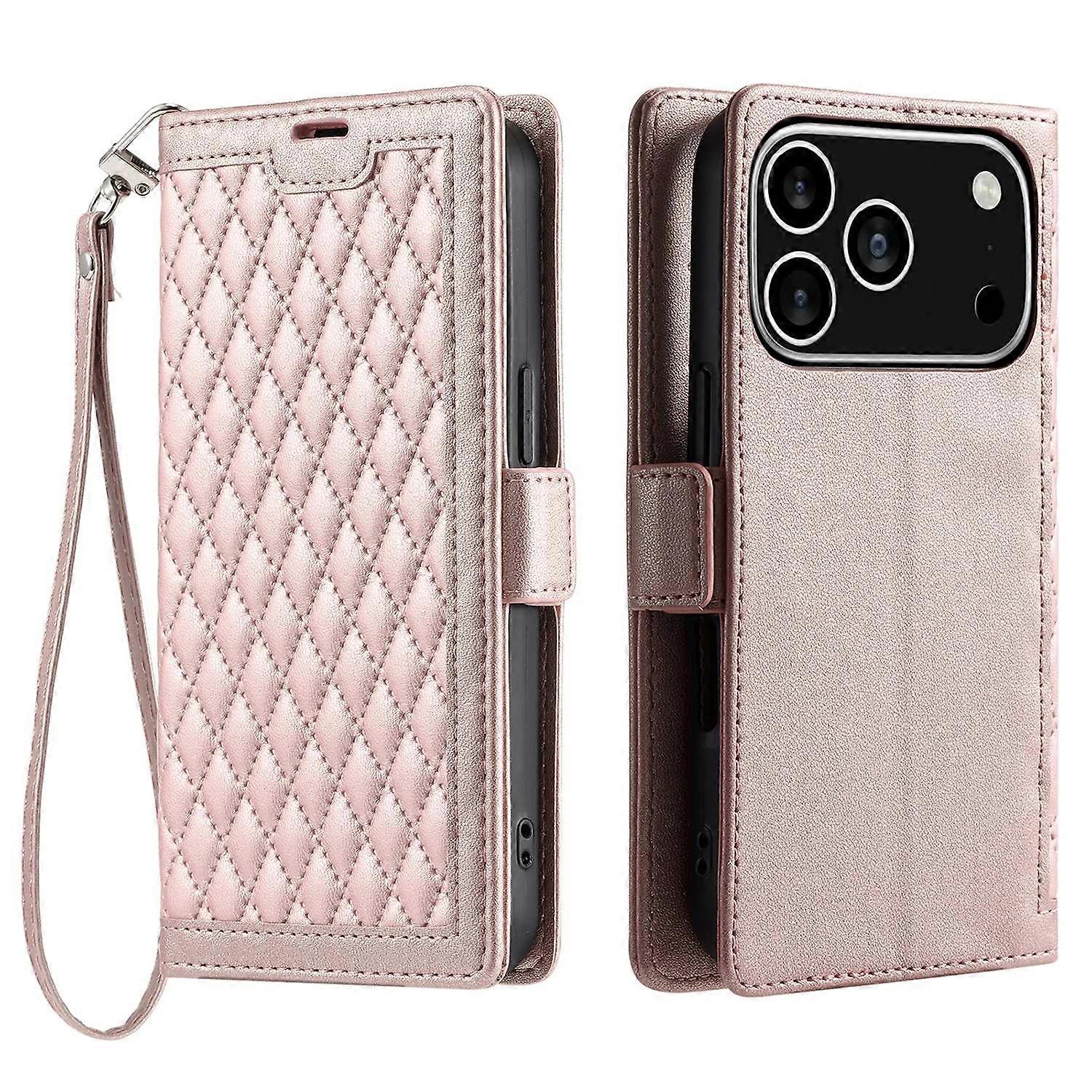 For iPhone 17 Pro Leather Case Rhombus Texture Wallet Stand Phone Cover with Wrist Strap