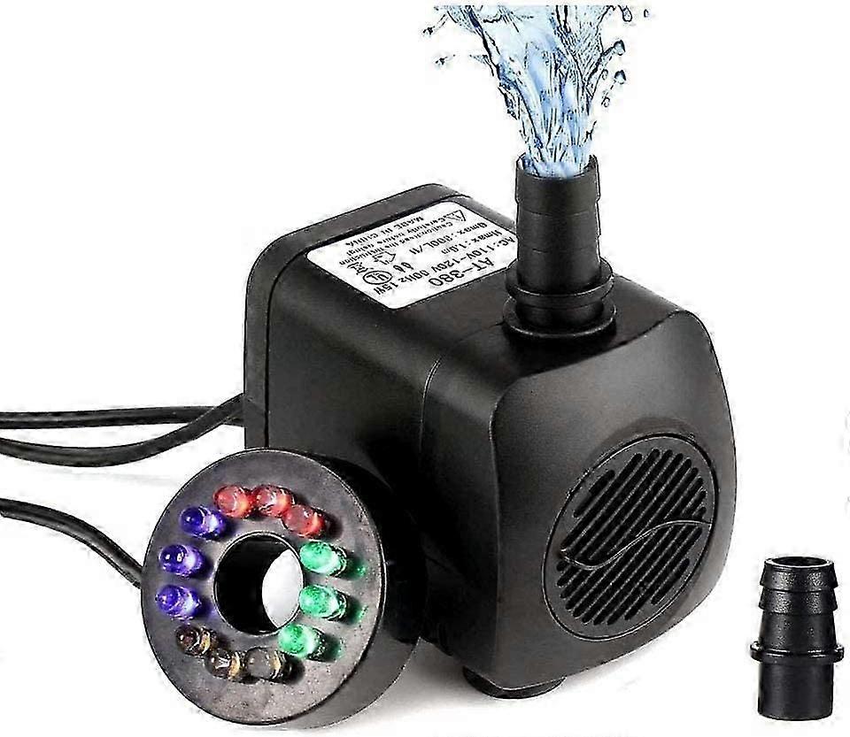 AC powered electric submersible water pump, quiet operation. Low voltage water pump with 110-120V 60Hz.Stunning waterproof LED lights (4 colours red, blue, green, yellow) provide an amazing evening shine.Maximum flow: 800 l/h; maximum lift: 1.6 m; 15 watt power; suitable for 0.5 inch pipes.Suitable for fresh water, salt water. This submersible pump is used in aquarium, fountain, nozzle and hydroponics. The small size makes the pump easy to clean and hide.This water pump is designed for reliability and quiet operation. It is corrosion-resistant, acid-resistant and durable.