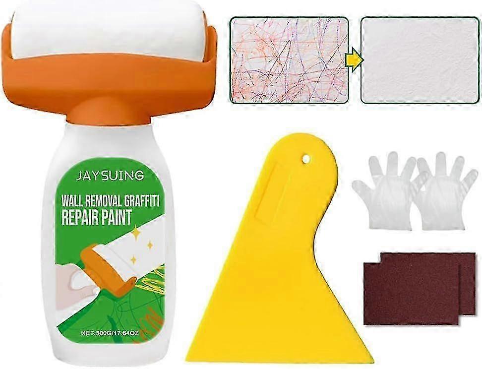 Wall Repair Rolling Brush, 500g Fast-Drying White Wall Paint with Scraper, Sandpaper & Gloves, Wall Repair Kit for Graffiti Scratches Stains