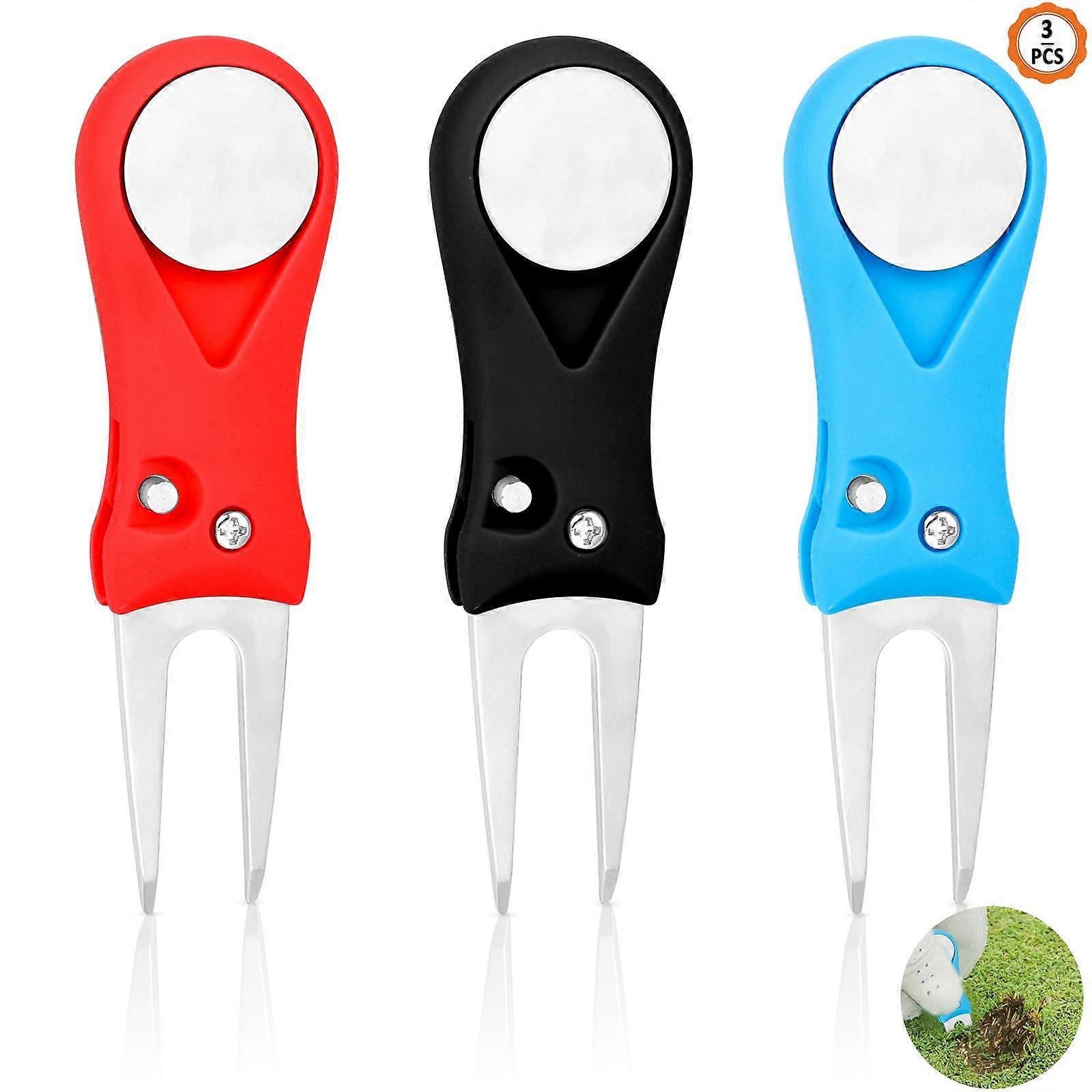 Golf Divot Tool Set of 3, Foldable Stainless Steel Pitch Fork with Removable Ball Marker, Black Blue Red Colors