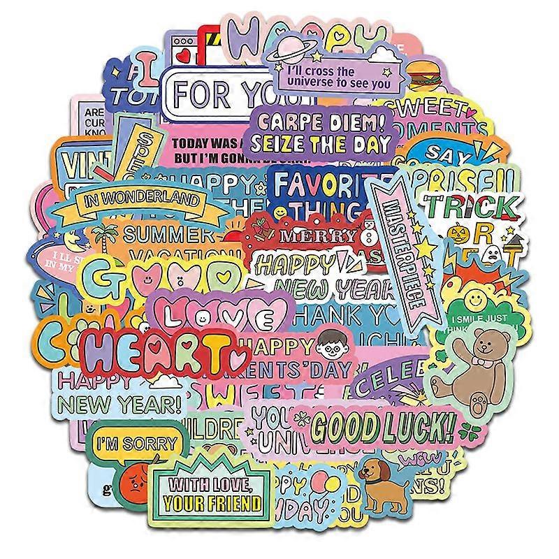 Korean ins style cartoon text stickers waterproof removable graffiti cute girl style diary mobile phone decoration stickersMaterial: PVC waterproof removableSize: 4-6cmPackaging: opp bag (55 sheets in a set, matte)Weight: about 30g/bagDecorate your water bottle, laptop, computer, mobile phone case, suitcase, skateboard, cooler, bumper, car, bicycle, motorcycle, keyboard, scrapbook, mirror, notebook, folder, refrigerator, wall, window, room and furniture, etc. Great gift for children and girls: These beautiful stickers are the perfect gift for children, teenagers and girls.Note: The following materials are not recommended, such as frosted material, grid material, linen canvas material, three-dimensional texture material.