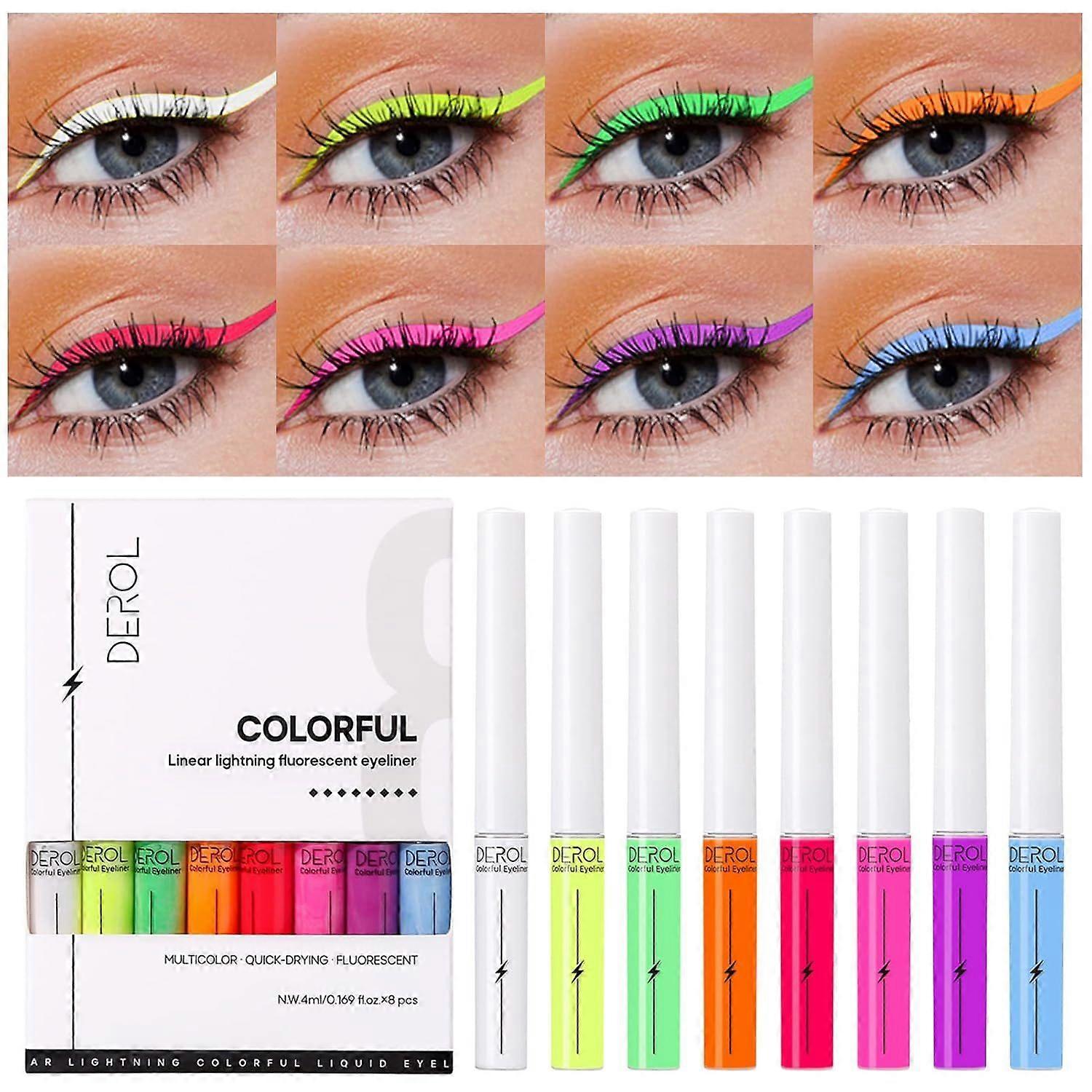 8 Colors Lightning Fluorescent Eyeliner, Neon Liquid Eyeliner Set, Halloween Waterproof Smudge-proof Pigmented Matte Colorful Eyeliner, Eye Makeup Gif