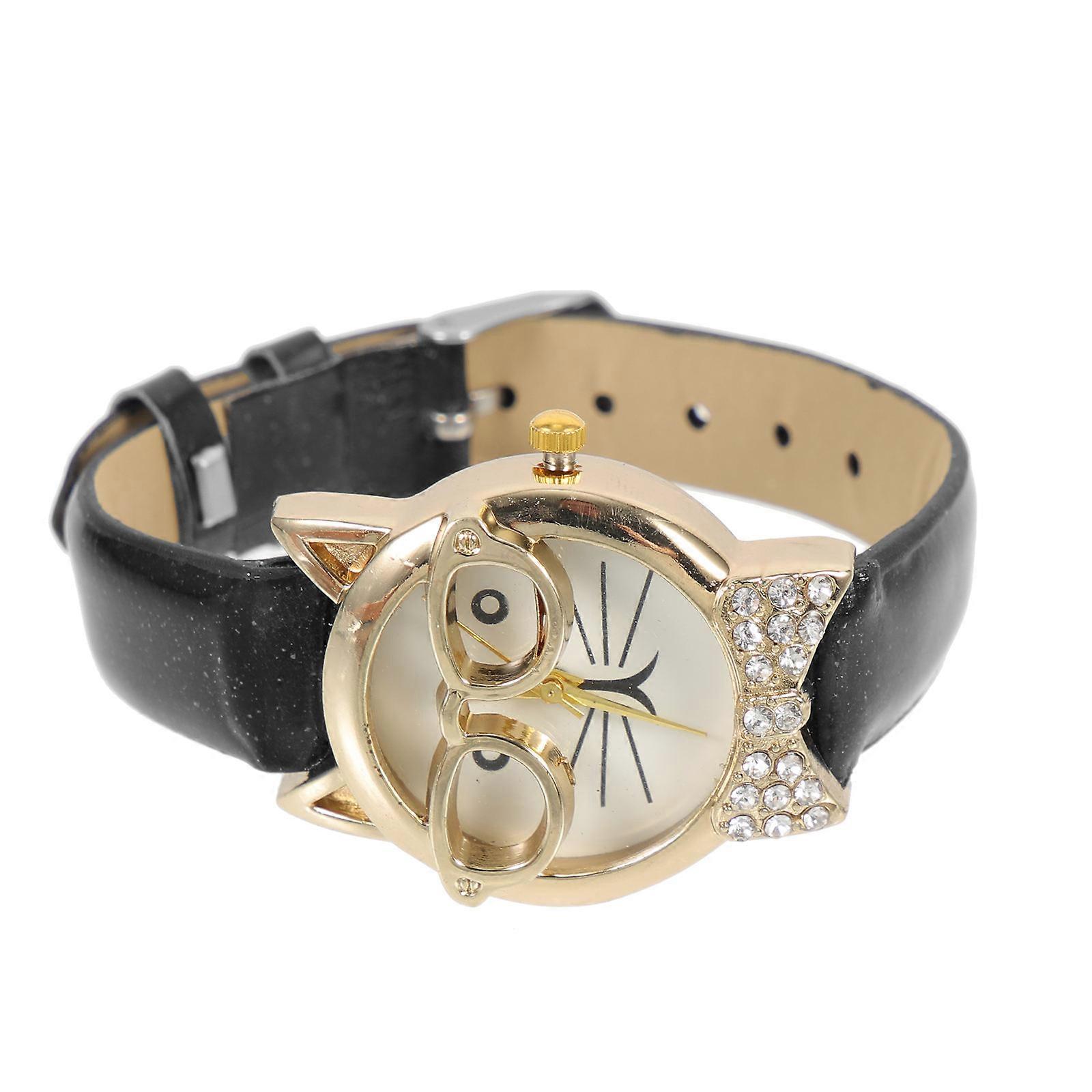 Girl Gift Watch Black Alloy Cat Face Charm Decorative Hands Wrist Watch for Kids Wearing