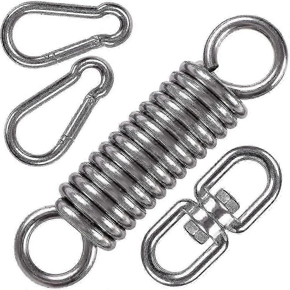 Universal Swivel Hook Hanging Kit for Hammock Chair Porch Swing WIDELY USE: Enjoy your indoor and outdoor recreation with our swing spring hanging kit which is specifically designed to hang your swing chair, swing seat, hanging chair, hammock, tent, boxing, porch swing, punching bag or other heavy object, Introducing a unique even suspension system for hours of movement in silence with safe, smooth swinging pleasure. Perfect for your patio, porch, horizontal tree log or ceiling mount.<br> HIGH QUALITY: The comfort springs are made with a high-strength spring steel, which are zinc-plated and clear-coated to provide protection against the elements and rust-resistant. swing swivel and snap hooks are made of stainless steel, corrosion resistance,high hardness, non-toxic and pollution-free environment.Suitable for any scene.<br> SAFE AND SECURE: the springs are tightly coiled together for effective shock absorption enhancing the comfort of your porch swing with every movement, enhancing your comfort and protecting your overhead support.which is safe for adults and children of all ages,the swivel hook allows 360 degree rotation without any tangling or twisting, and the snap hook will securely clip onto your hammock or swinging chair.<br> EASY TO INSTALL:You can easily install this spring set to your hammock chair within minutes without using any tools, universal to fit any size, style or design hammock, You will get: 2*8mm snap hook x 1* spring x 1*360 degree rotation hook.