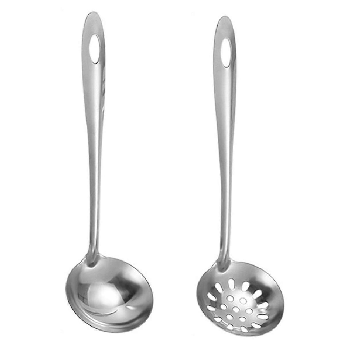 ATTRACTIVE, HEAVY DUTY & EASY TO USE: We have designed our stainless-steel Soup ladle with the craftsmanship and excellence that and professional have come to expect in kitchen utensils. Made from premium, heavy-duty stainless steel polished to a beautiful mirror finish, it up your kitchen and deliver professional quality results, meal after meal. & FUNCTIONAL DESIGN: Premium stainless steel construction. Built with a balanced blend of beauty, strength and comfort. The long handle is very comfortable in hand, with a contour that offers a natural thumb rest and a secure, non-slip grip. With ample bowl capacity it is perfectly proportioned for stirring, serving soups, stews and more. ERGONOMIC HANDLE: Premium design and construction. The large ladle head can spoon out large portions with each scoop. The handle easy and comfortable use, and provides a secure grip. There is a convenient hole in the handle for easy hanging storage. EASY TO CLEAN: Heavy gauge stainless-steel construction, dishwasher safe and also cleans up quickly and easily in the sink. Wont rust or corrode like regular metal. The deep bowl is perfect for stews, chili, spaghetti sauce and soups too. Our ladle of all of your scooping needs. APPLICABLE TO MANY OCCASIONS: Can be used for home, restaurant, hotel, picnic, when you need it, it can be used for soup, hot pot, fried food, stirring and filtering, etc. Beautiful spoon and perfect for gifting. SOUP LADLE & SLOTTED SPOON SET: 2 Pieces set, soup ladle is used to take delicious soup, sauce, juice;slotted spoon can scoop soup residue or meat, corn, chicken and other food in pot, it can Meet your dining needs. Color:A:Silver Material:Stainless Steel Package Contents: 1 * Soup spoon 1 * Slotted spoon Only the above package content, other products are not included. Note: Light reflection and different displays may cause the color of the item in the picture a little different from the real thing. The measurement allowed error is +/- 1-3cm.