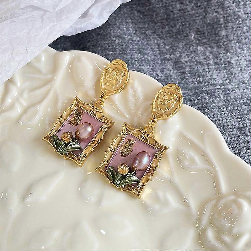 Vintage oil painting style freshwater pearl earrings for women with tulip flower earrings, S925 silver pins, copper plated with 18K gold, purple