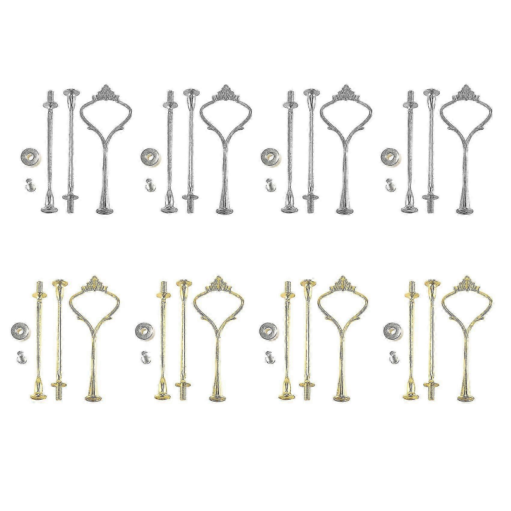 3 Tier Crown Cake Plate Stand Fittings 8 Sets Silver Golden Holder for Wedding Party Kitchen Decor What's included: there are 8 sets of hardware fittings for cake stand mould in this package, available in 2 beautiful colors of gold and silver, 4 sets for each color, these cake tray holders are suitable for different styles of plates.<br> Different combinations: these plate holders can be combined with 2 or 3 layers of plates, or even more layers, which are suitable for fixing handmade silicone cake pans to make your own exquisite handicrafts.<br> Quality material: cake stand fittings are mainly made of zinc alloy, the smooth surface is in electroplated silver color and gold color, strong and easy to assemble, Perfect handmade accessories for making cake stand.<br> Easy to apply: just install the finished resin work into a cake stand, connect parts and tighten all parts in just a few minutes; It can be disassembled when not in use, which is convenient for storage and carrying.<br> Warm gift: apply these hardware holders to make a mini cupcake stand by yourself, which can be warm gifts for friends or family, fit for weddings, party, tea party, graduation ceremony, family gatherings, Christmas, Thanksgiving and more.<br> Material:Zinc alloy<br> colour:Gold + Silver<br> Package Contents:<br> 4 x silver cake pan stand<br> 4 x Golden cake tray holder<br> Only the above package content, other products are not included.<br> Note: Light and different displays may cause the color of the item in the picture a little different from the real thing. The measurement allowed error is +/- 1-3cm.