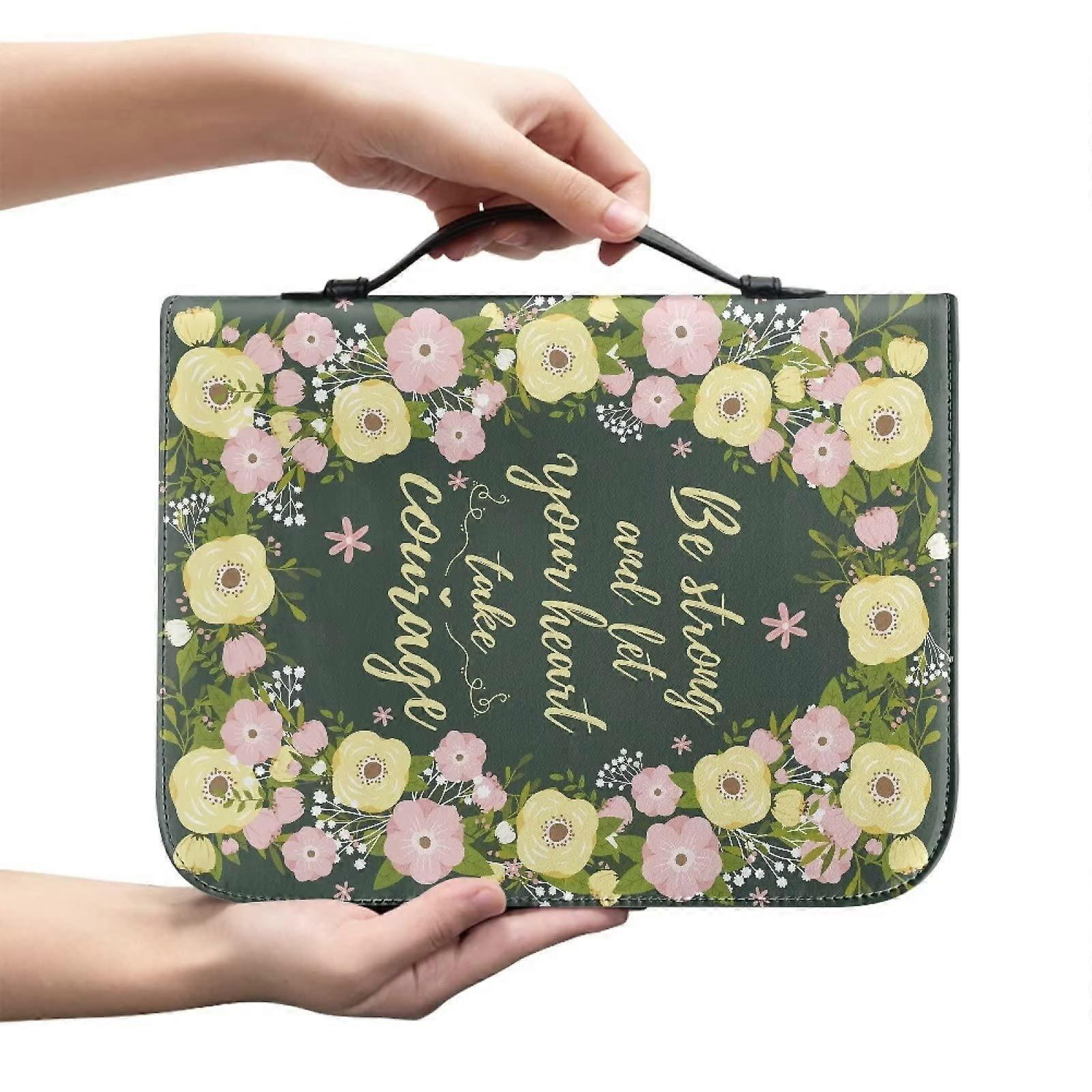 Floral Bible Cover Leather Zippered Holder with Writing Pocket and Handle, Be Strong and Take Courage Design