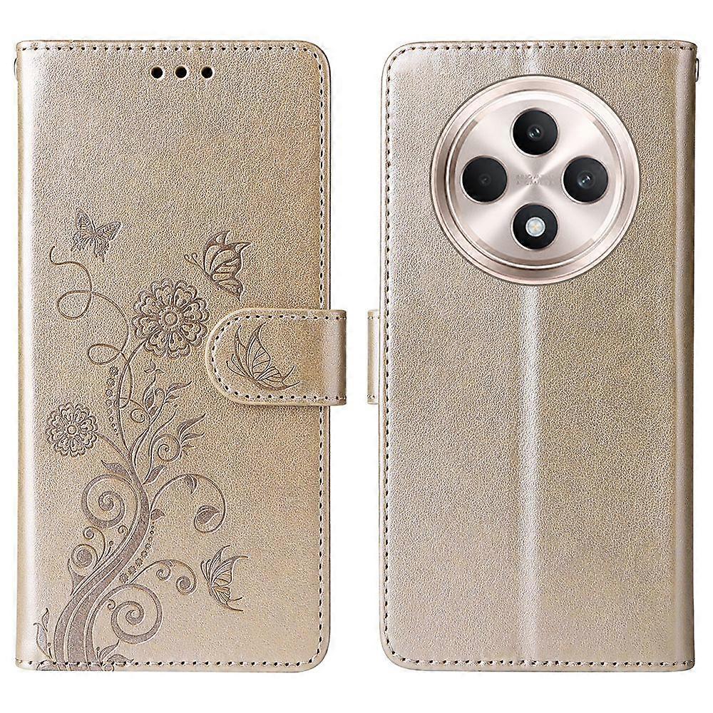 For Oppo Reno12 F 4G Leather Case Butterfly Floral Imprint Wallet Stand Cover - Gold