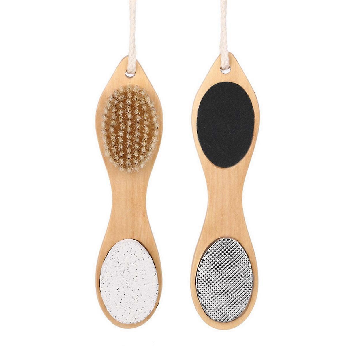 FOOT PROBLEM SOLUTION - Tired of cracked heels, rough patches, and dry skin that socks or sandals? This pedicure kit helps tackle calluses, dead skin and hardened areas so you can feel confident showing off your feet. 4 IN ONE FOOT CARE KIT - Features a Dry Brush to away dryness, a Pumice Stone for feet to smooth calluses with circular , a Stainless Steel Foot File to gently remove tough, dry skin, and a Sandpaper for precision exfoliation using light pressure. Everything you need for smooth, refreshed feet in one tool. SPA RESULTS FROM HOME - Enjoy the luxury of smooth, salon-quality feet without leaving . This foot scrub kit exfoliates dry skin and callus remover, helps improve circulation, and reveals healthier-looking skin. No appointments, no hassle, just soft feet on your schedule. EASY TO USE - Soak your feet in warm water and pat dry. Use the pumice stone in circular on callused areas, the stainless steel file in gentle up-and-down strokes to remove dry skin, the sandpaper with light to medium pressure for micro-sanding, and the dry brush to away any remaining dryness. Rinse after each use and air dry. Simple, effective, and easy to add to your weekly self-care foot spa routine. NATURAL MATERIALS - This pedicure tool for feet is crafted with skin loving, natural friendly materials including bamboo, natural pumice, gentle bristles, and a stainless steel file. A foot callus remover, a heel for cracked heels and more is designed for those who want effective results without compromising on clean, responsible self-care. Color: As Shown Material: Wood Size: 20x6.5cm Package Contents: 2pcs x 4 in 1 foot scrubber Only the above package content, other products are not included. Note: Light reflection and different displays may cause the color of the item in the picture a little different from the real thing. The measurement allowed error is +/- 1-3cm.