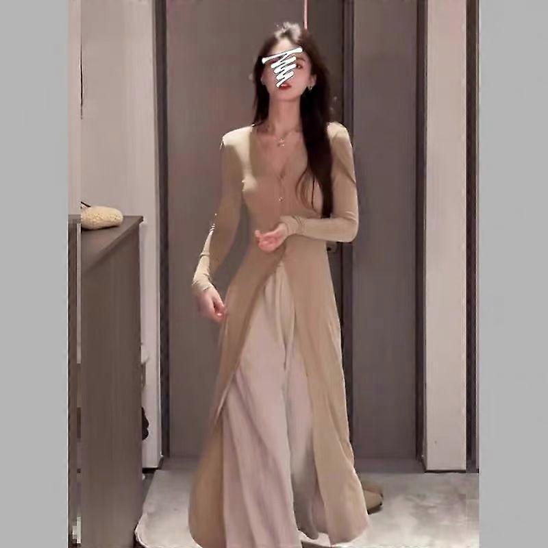 Gentle Women's Long Solid Color Sweater High Slit V-Neck Slim Fit Figure Flattering Knit Cardigan Summer And Autumn Long Sleeve Coat Top