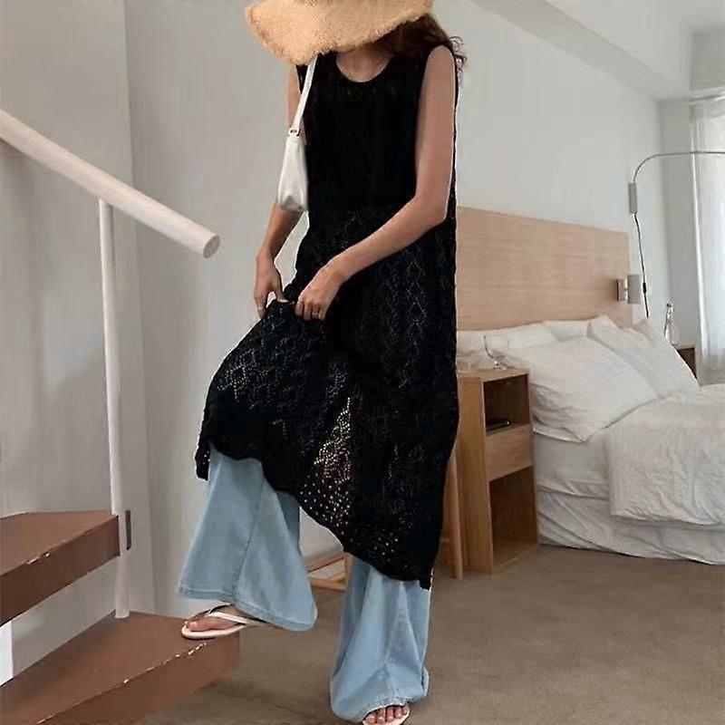 Korean-Style Hollow-Out Overwear Blouse Dress Women's Summer Thin Short-Sleeved Split Mid-Length Sweater