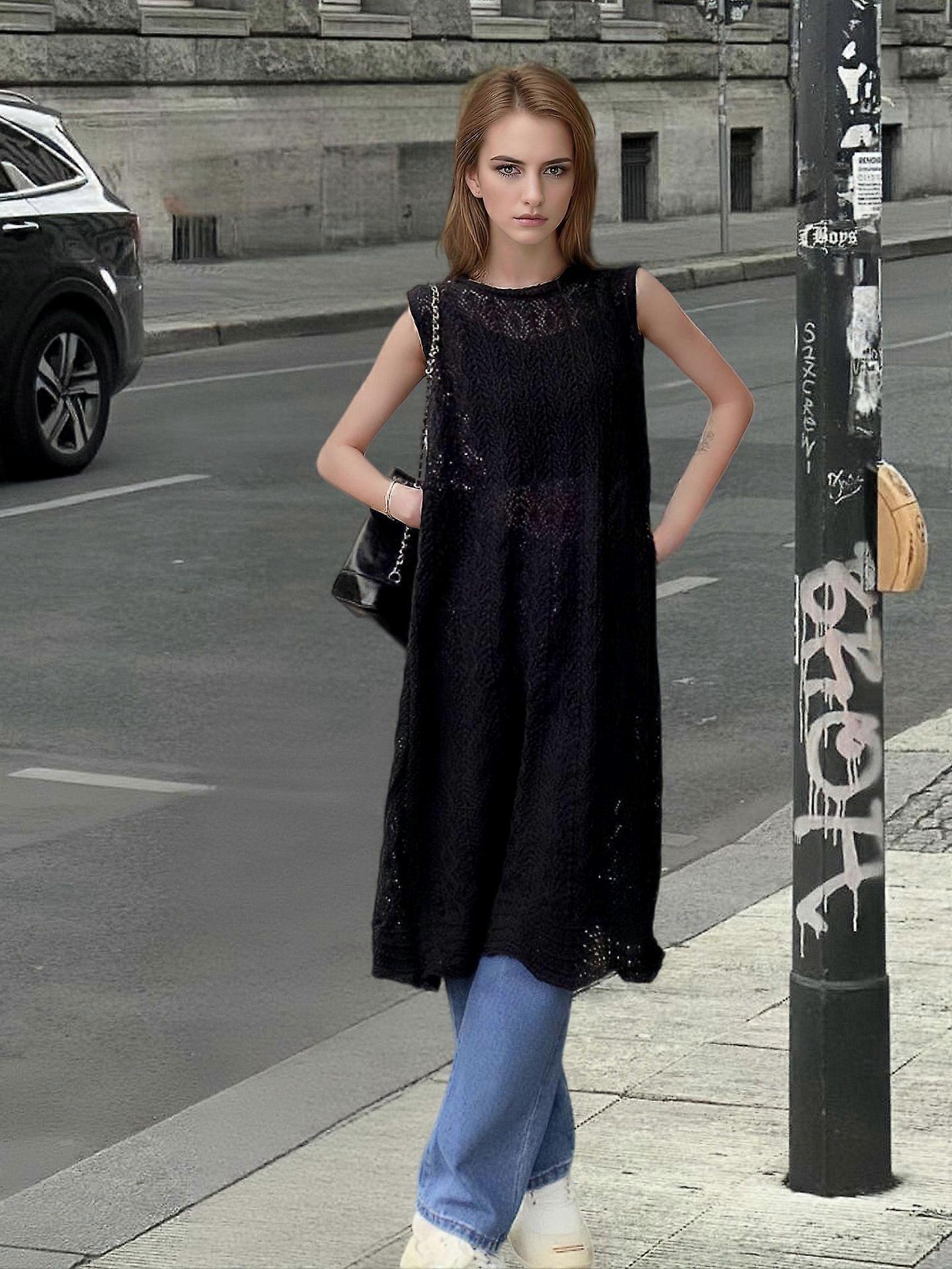 The Hot Girl Wears Two Round-Neck Pullover Long Dresses In The Front And Back, A Thin, Cut-Out Knitted Smock And A Slit Vest