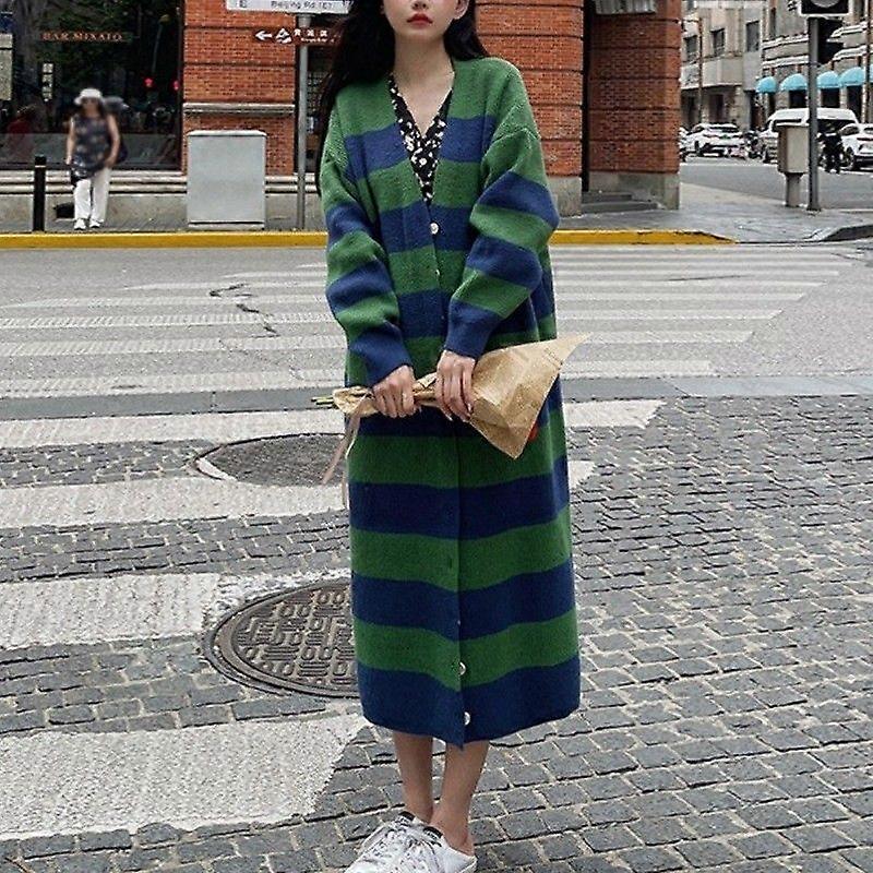 This Long, Striped, Retro Women's Autumn And Winter Loose, Korean-Style, Laid-Back Knitted Cardigan Is Versatile