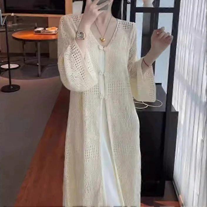 Chinese-Style Button-Up Hollowed-Out Knitted Cardigan, Mid-Length, Knee-Length, Long-Sleeved, Sun-Protective Blouse And Skirt For Women In Spring And