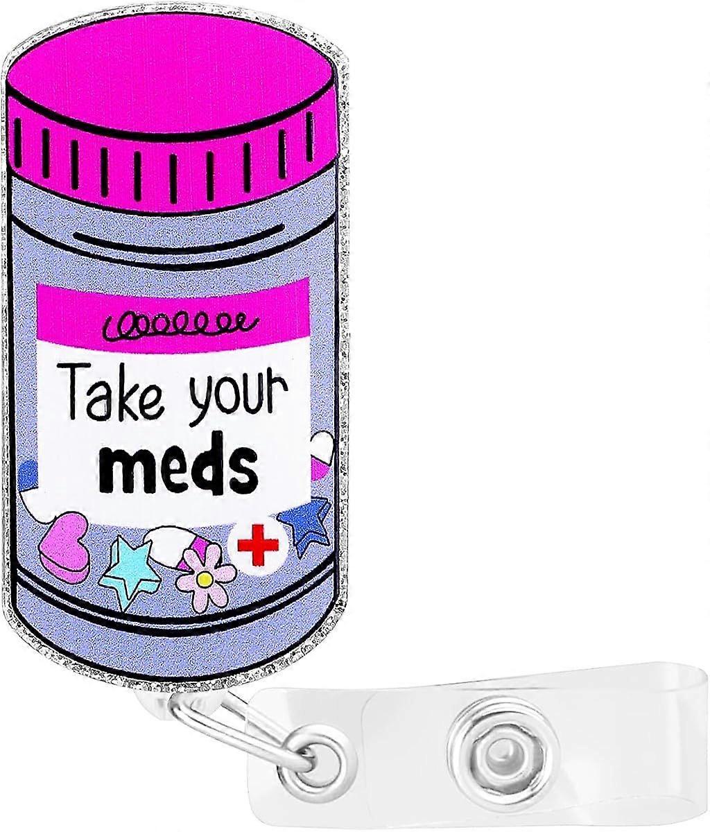 Funny DesignThis nurse badge reel holder features a distinct "take your meds" design adding a touch of charm and humor to your work attire, ideal for medical professionals. Retractable ConvenienceWith a 65cm retractable cord and a secure clip, this retractable id card clip allows for easy scanning in and out of the office, making it practical for medical staff. Secure ClipThe 360-degree swivel clip of our pharmacy funny name tag holders firmly attaches to your clothing, ensuring your badge or ID stays in place during your workday. Essential for Medical WorkersAn essential accessory for nurses, doctors, students, and other healthcare professionals, this pharmacist badge brooch is lightweight and built to last, all while bringing a smile to your face. Quality and VersatilityCrafted from shiny acrylic, this badge clip is not only cute but durable. The medical assistant badge reel holder functions as both a badge holder and a fashionable accessory, and makes a great gift for colleagues and friends.