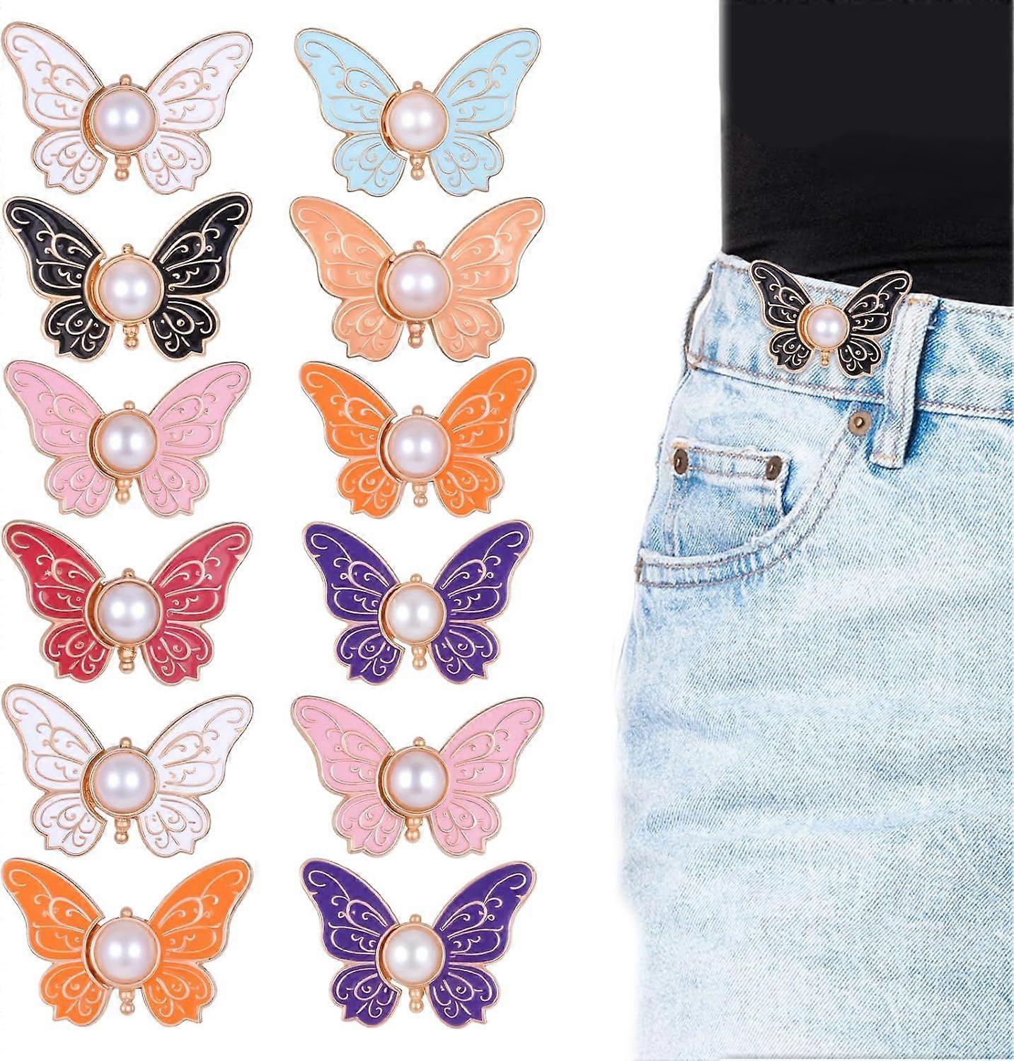 12 Pcs Butterfly Waist Tightener,Random Color Detachable Jean Buttons for Loose Jeans, No Sew and No Tools Decorative Waist Buckles, Adjustable Jean B