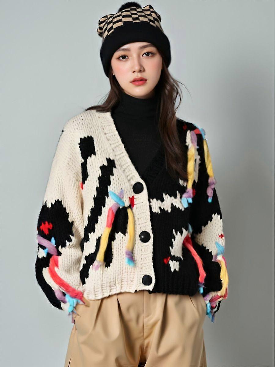 Women's Handmade Knitting Needle Crocheted Color Matching Tassel Thickened V-Neck Knitted Cardigan Coat Sweater